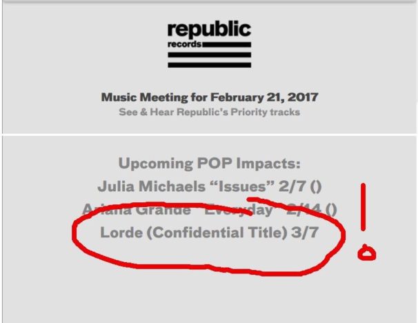 Father John Misty ya había anunciado su nuevo trabajo, Pure Comedy, para el 7 de abril, pero el anuncio de la aparición de Lorde en el show televisivo esconde cierta incógnita detrás. Es muy raro que un artista visite el plató sin tener material nuevo a promocionar, y más aún si tenemos en cuenta que su último álbum -Pure Heroine- se remonta ya a 2013 y lo más reciente que tenemos de la neozelandesa es el single Yellow Flicker Beat, lanzado en 2014 para la película "Los Juegos del Hambre". Además en un pantallazo publicado de la mano de Republic Records se pudo ver lo siguiente: