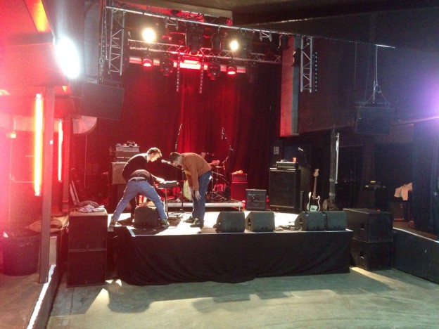 El escenario era alargado y ni siquiera entrábamos todos con el equipo. Además, justo delante había una columna de más de un metro de ancho en pleno centro. El techo era bajo y abovedado. El clásico garito punkarra de toda la vida. Al equipo enchufamos los micros de voz y bombo (que ni siquiera había suficientes para todos) y a correr. El día que más fuerte hemos tocado hasta el momento y probablemente el más pequeño.