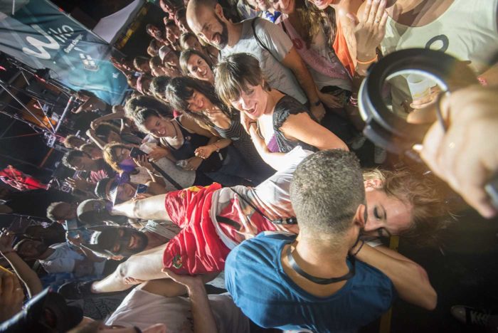 Sidonie, el siguiente concierto del escenario Estrella Damm, provocó un llenazo que no se había visto en ningún grupo nacional hasta el momento. En el divertido show del animado grupo de Barcelona con Marc Ros a la cabeza se interpretaron temas de “El Peor Grupo del Mundo” que fueron coreados por todos. Fue una de las bandas que más interactuó con el público, sin duda. En parte también porque ya tiene marcados una serie de “momentos clásicos” en sus conciertos, como el paseo a hombros del cantante en la canción “Un Día de Mierda” o el extenso solo de percusión de “En mi Garganta”. Rindieron además, un pequeño homenaje al “Subterranean Homesick Blues” de Bob Dylan intercambiando en grandes carteles blancos el texto de una de sus más famosas canciones “No sé Dibujar un Perro”.