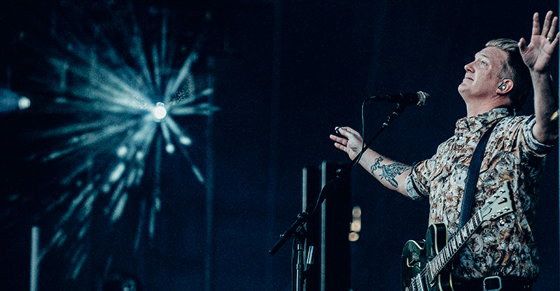 Queens Of The Stone Age, en escena tras una intro con la voz de Gene Kelly en Cantando bajo la lluvia y la música siniestra de La naranja mecánica -perfecto contraste-, estuvieron a la altura de lo que se esperaba, pese a un sonido algo enlatado que fue mejorando según daban salida a su set list. El rock recio y agreste de Josh Homme y sus muchachos se fue apoderando del recinto según se ponía el sol. El frontman se las tuvo tiesas durante casi toda su eléctrica actuación con los miembros de seguridad, a los que reclamó, de manera cada vez más expeditiva, que dejaran entrar al público en la zona frontal acotada (ciertamente, cuesta entender la decisión de separar una parte de la zona delante del escenario, y no sólo por razones estéticas o de simetría). El pequeño conflicto no le impidió poner toda la carne en el asador en canciones de la intensidad de If I Had a Tail, The Way You Used to Do o You Think I ain´t Worth a Dollar But I Feel Like a Millionaire.