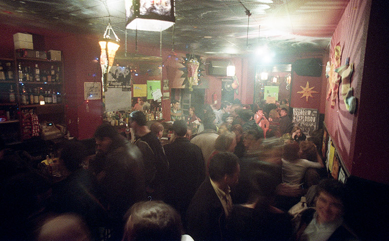 "1998-2003. Realmente, estas fotos traducen muy bien la visión que tenía yo en el bar, y de la vida, así, tan borrosa, movida… Esa euforia, ese hedonismo, esa ausencia de realidad se nota en la decoración con lámparas surrealistas, y ese techo… Llamé a un grafitero para que me pintara el bar entero, y convertí el bar en un tugurio de psicodelia. En el Esperanza de Manta Ray hay un tema que se llama Nacht Frost, noche de bruma, que Frank lo quiso nombrar así porque era como él veía las noches en La Plaza…"