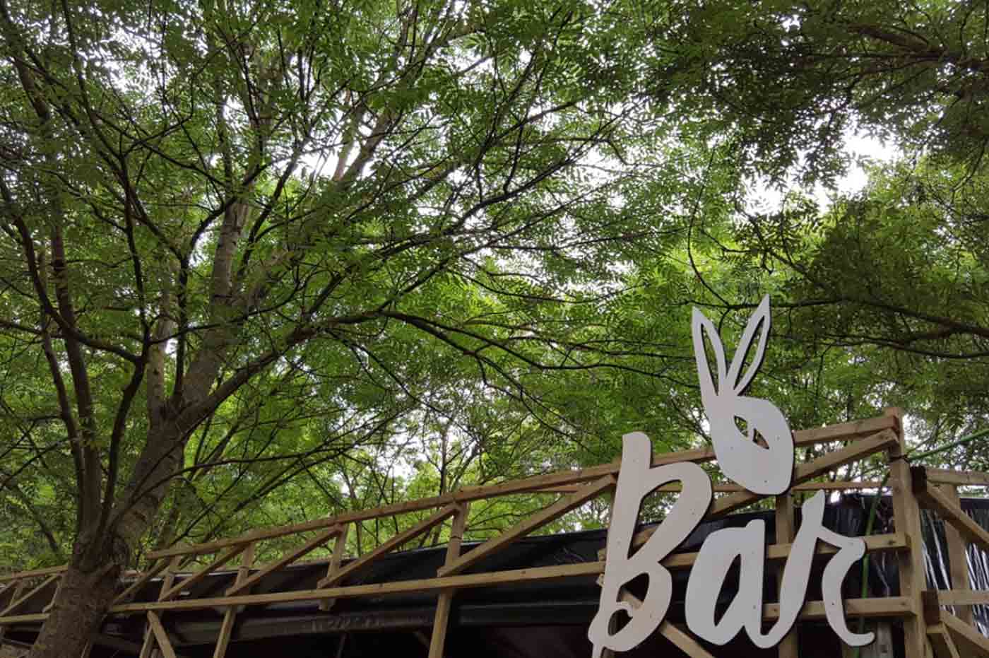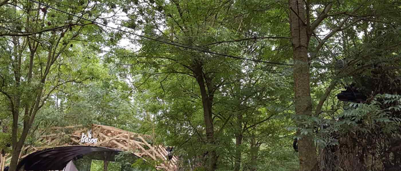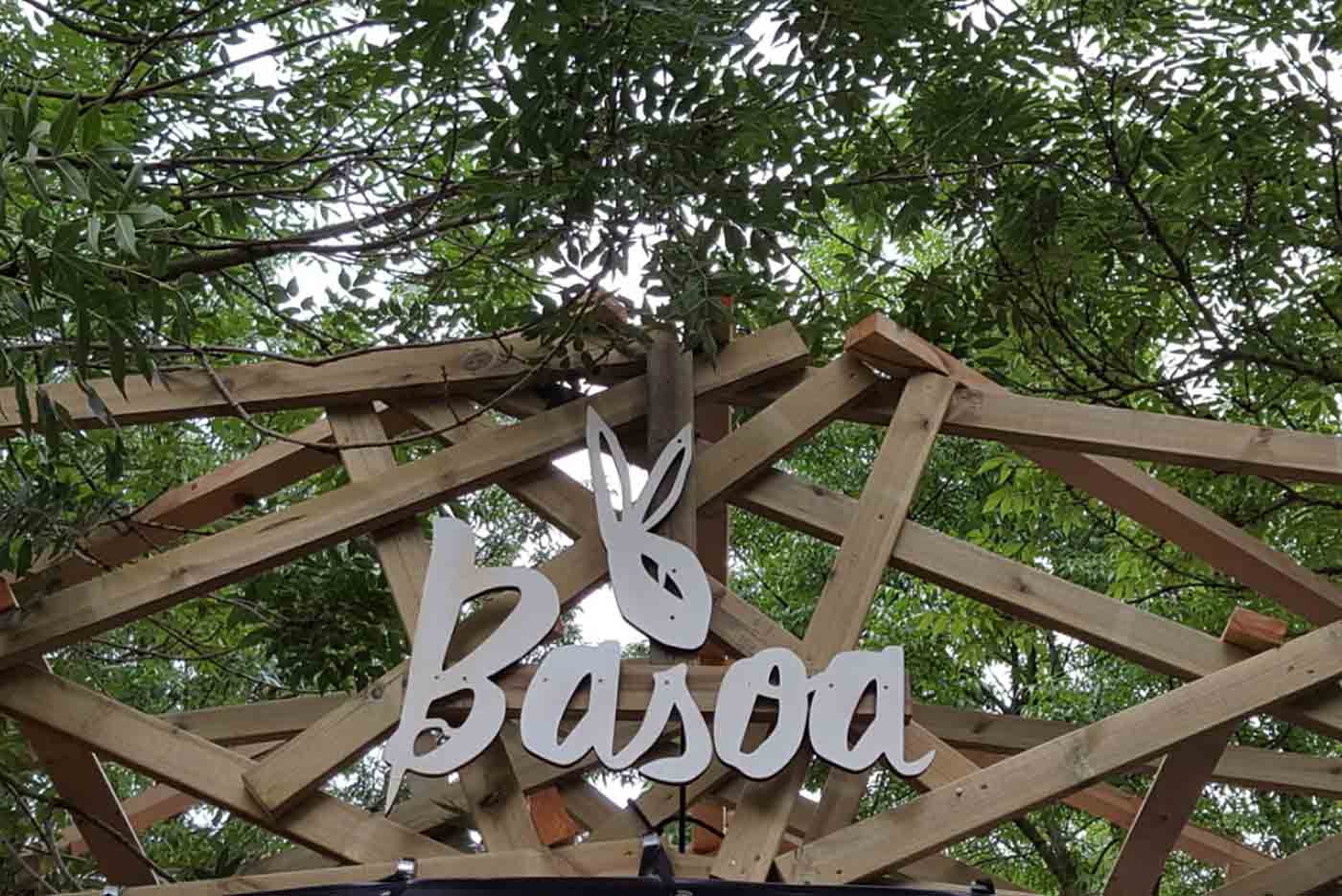 La Zona Basoa comienza tras dejar la parte trasera de la Carpa Stage. Los árboles se van multiplicando y tras andar unos pocos metros por el camino, te recibe el letrero, sostenido por troncos y acompañado de numerosas ramas, detalle generalizado en la decoración del espacio. Tras unos pocos metros, llega el Bar, una caseta construida con madera para la ocasión donde se sirven las bebidas.