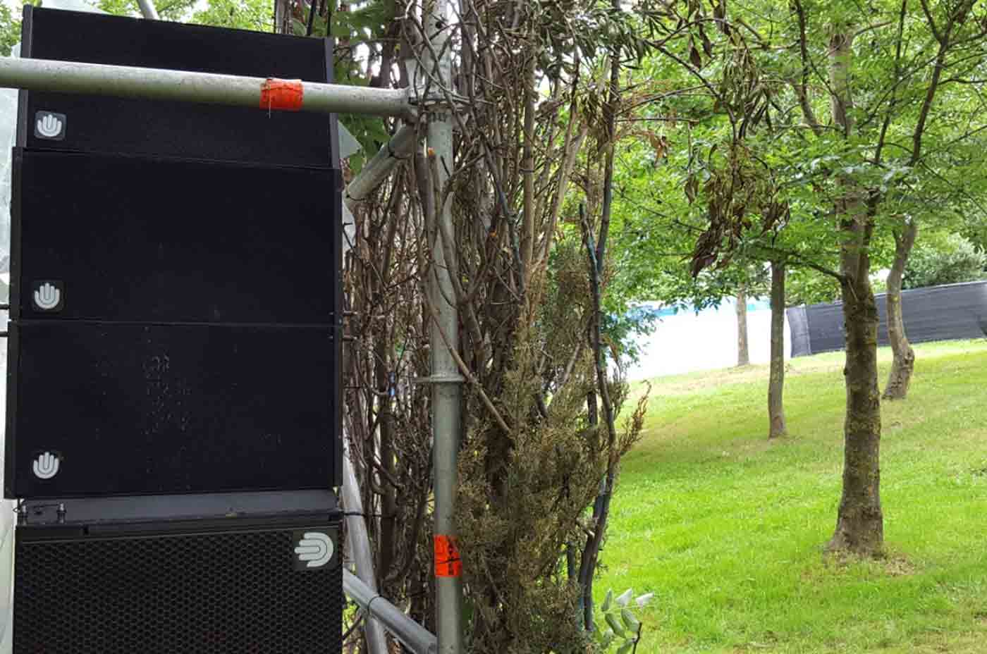Tras el Bar, nos encontramos con varias torres de PA's camufladas con ramas...eso quiere decir que hemos llegado a la pista de baile. Nos encontramos a varios técnicos encaramados a las torres. Sin duda la zona se ha preparado al detalle para conseguir la mejor experiencia posible. Un total de 8 torres en circulo con un pequeño escenario en uno de sus bordes destrozarán los tímpanos de las más de 2.000 personas que bailarán en la verde pista de baile. La rave festivalera en el bosque está servida.