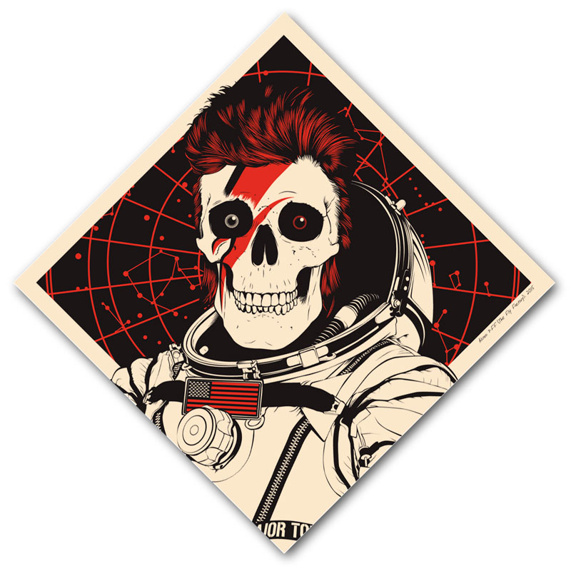 Depende mucho del artista que te lo pida, pero en general ya vienen buscando "mi estilo", por lo que me dejan bastante libertad a la hora de trabajar. Normalmente empiezas con una charla para que te cuenten cómo lo ven ellos, qué referencias tienen, qué les gusta y a partir de ahí es cuando empiezas a bocetar en busca de "la idea". Siempre hago unos dibujos a mano antes de empezar con diseño vectorial. El proceso creativo me imagino que será igual en todas las disciplinas, es darle vueltas y vueltas, hasta que consigues dar con la idea que te entusiasma. Hay veces que sale en muy poco tiempo y otras veces te pasas picando piedra días hasta que das con lo que andabas buscando.