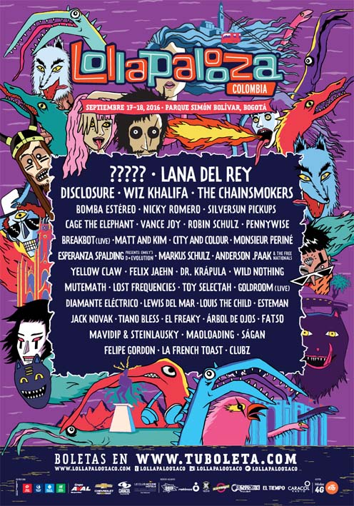 Lana del Rey, Disclosure, Wiz Khalifa, Mutemath, Vance Joy o Cage The Elephant son algunos de los artistas que se destacan como cabezas del cartel, que está complementado con sonidos colombianos de la mano de Bomba Estéreo (banda que ha participado en la versión de Lollapalooza Chicago), Diamante Eléctrico, Fatso, Esteman, Arbol de Ojos y un listado de bandas seleccionadas de primera categoría.