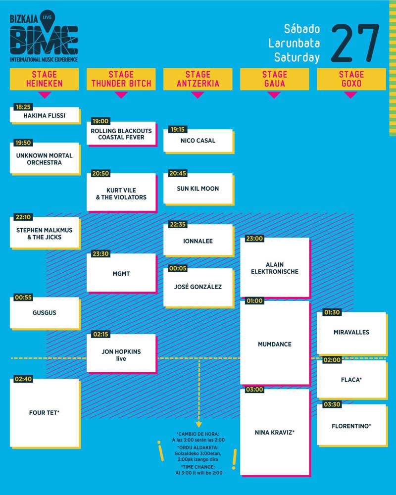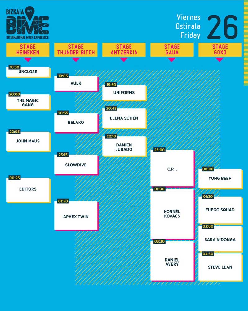 Esta tarde se da el pistoletazo de salida a la primera jornada del festival y pasarán por sus distintos escenarios artistas y bandas como Aphex Twin, Editors, Slowdive, Damien Jurado, Belako y John Maus, entre otros. Mañana será el turno de Nina Kraviz, Four Tet, Jon Hopkins, GusGus y José Gonzñalez, entre otros. Ojo al cambio de hora que a las 3 serán las 2.