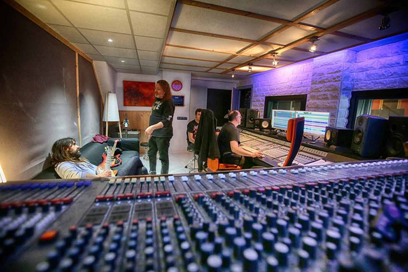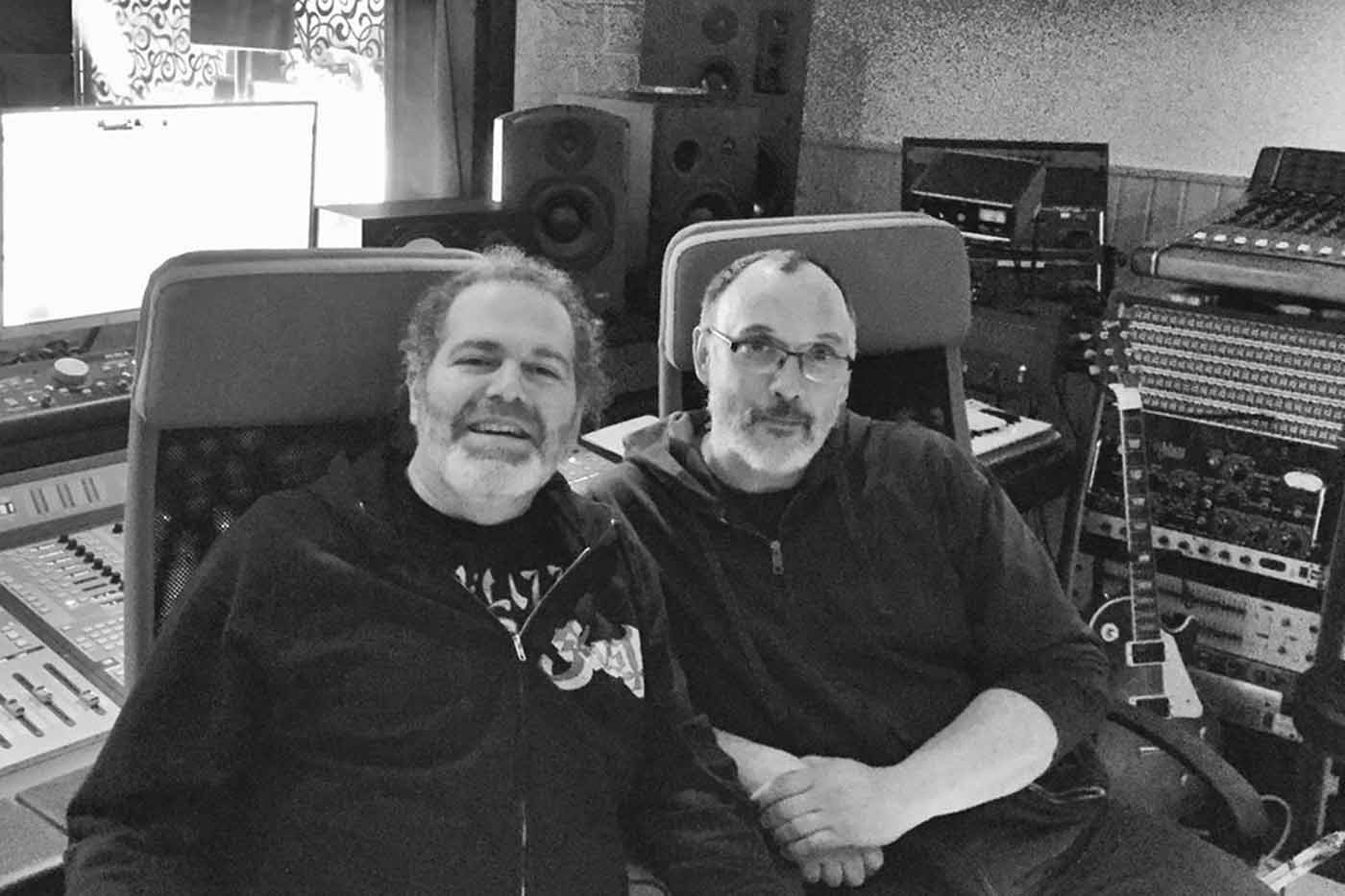 LUNES 25 ABRIL: A partir de este día todo se hace más confuso en la memoria. Básicamente hoy Jorge graba todas sus guitarras rítmicas en una maratoniana sesión. Dean está ya totalmente calentado con el curro y ha creado con Asier (foto inferior) un equipo imbatible. Surgen muchas ideas para arreglos, se toma mucho café y se fuma mucho. Unai, el manager de la banda y responsable de la agencia Third Eye Society llega al estudio entrada la noche. Acaba de llegar de una gira europea con otra banda y viene cargado de regaliz holandés, caramelos franceses y chocolate belga. Bienvenido sea.