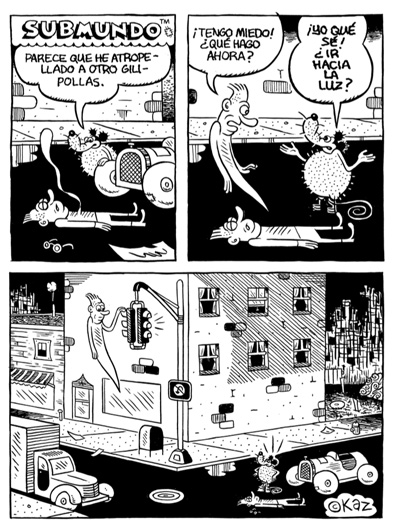 Los dos primeros tomos publicados en 2012 y 2015 recopilaban los cinco volúmenes con los que Fantagraphics despachó en USA la obra de Kaz, incluyendo incluso alguna que otra tira inédita. Pero mientras eso ocurría Fantagraphics se lanzaba de cabeza a una empresa aún más ambiciosa, la publicación del integral Underworld: From Hoboken to Hollywood, 312 páginas que sumaban al material ya publicado abundante material desperdigado y sobre todo la producción más reciente de Kaz para la serie. Como una cosa es ser romántico y otra muy distinta estar majareta perdido, la editorial mallorquina completa ahora este tercer volumen con ese material inédito en castellano, renunciando al suicidio comercial que sería editar el integral con la publicación de Submundo y Submun-dos todavía reciente.