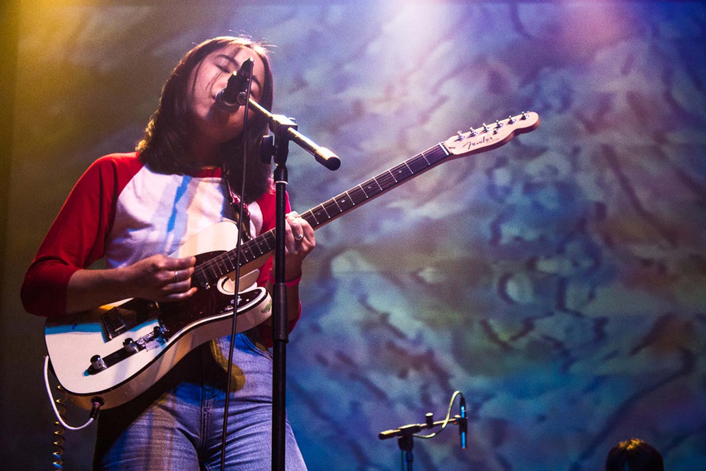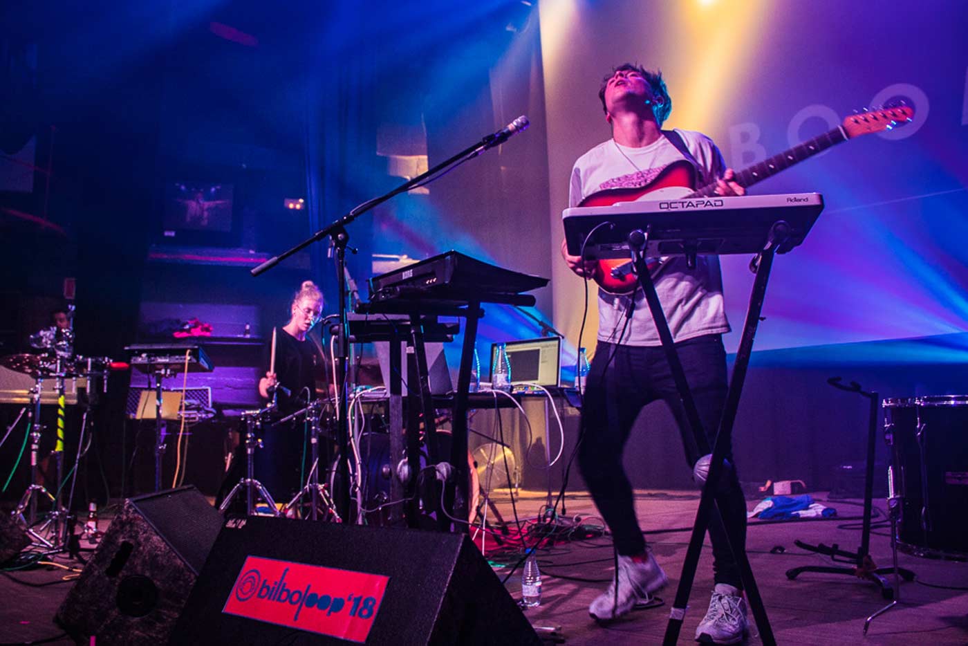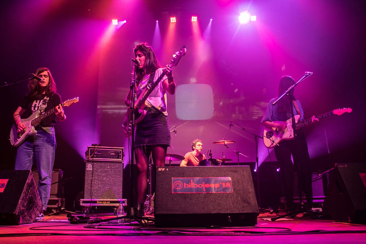Una de las cualidades que tuvieron los tres bolos principales de la segunda cita de Bilboloop'18 fue su carácter sorpresivo. Lo que aparentaba ser una cosa, en directo fue otra. Llegó el turno del trio de Glasgow Dama Scout (foto inferior) y el indie atmosférico y brillante se ensució con distorsiones aberrantes que en ocasiones se confundían con fallos de la mesa… pero no lo fueron. Comenzaron en la cumbre con eclosión de sonidos en el tema “Sugar” y despliegue de ecos y delays en “Forget it´s good”. El gancho de este grupo es el aderezo de sonidos catastróficos en melodías suaves en casi todos los temas. La ecualización del pedal del bajo es la antítesis de la voz de Eva Liu y al unir los originales beats de la batería obtenemos un coctel sintético y poderoso. La voz principal parecía desaparecer en ocasiones y no cuadraba con la línea melódica. La sensación que apunté in situ fue la siguiente: La música de Dama Scout es una mezcla de sonidos que viajan entre el indie, la psicodelia, el metal, el punk y la distorsión aberrante. Exquisita eclosión. Tocaron “Milky Milk” y terminaron con “Toothache” después de otros cincuenta minutos. No hubo "beste bat"! ni "another one"!
