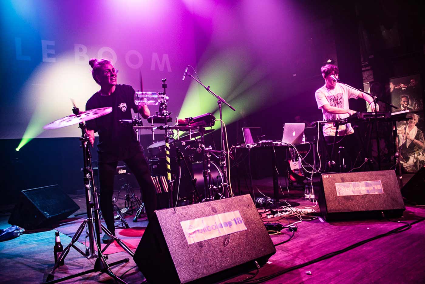 El grupo anterior se encargo de poner la mecha para volar la dinamita que vendría a continuación. La banda irlandesa Le Boom (foto inferior) demostró lo que es animar a una audiencia y controlar la situación desde el principio hasta el fin. Esta banda emula sonidos electrónicos con percusión acústica y utiliza numerosos medios técnicos de acompañamiento, voces y guitarra. O también podríamos decir que hacen música electrónica con referentes indie, pop y house en vivo. Hasta ahí bien pero lo que más mueve a Aimie y a Chris es la interacción con el público. Literalmente (sobre todo Aimie) se dejaron la piel en el escenario animando al personal y eso se vio recompensado. La pista de baile se convirtió en discoteca. Esta pareja tiene muy trabajada la ejecución de cada corte y nos mostraron un sonido cualitativo. A los recursos técnicos habituales, la batería y la guitarra hay que añadirle sampling pad, un soporte con diferentes mazos, cencerros y una botella vacía de Absolut Vodka. Fueron numerosas las veces que la irlandesa se bajó al público pero el ardor principal venía de sus gritos y su expresión corporal. Espectáculo bien recibido y broche final clamoroso para otra edición del festival Bilboloop que cada vez nos ofrece una propuesta más interesante que la otra. ¿Con qué nos sorprenderá el año que viene?