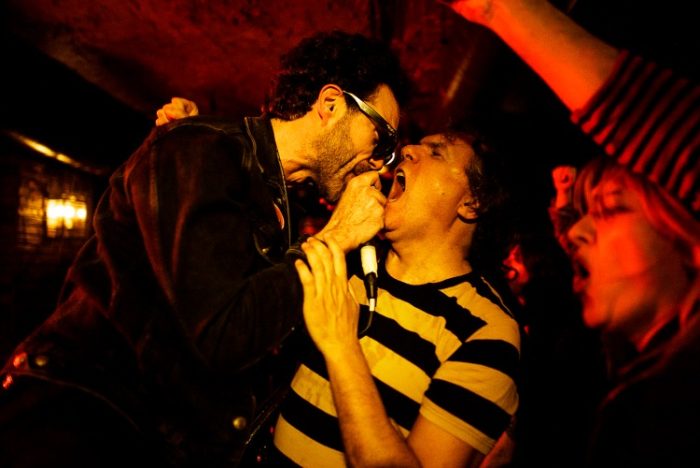 Comienza con chaqueta y gafas de sol, pero no tarda en estar desnudo de cintura para arriba y con la mirada destapada. Hay que decir que sí, hace todo eso y más: se sube a la barandilla y golpea el tubo galvanizado del aire acondicionado y se pasea por el público y se deja llevar por el aire y canta sobre la barra y vuelve con camiseta seca y usa el forjado como en un balancín, como si fuera un rocín y le da la mano a este y le canta al hocico al otro y… Sí, hace todo eso y más; pero, de la misma, también aguanta todo lo que le hacen a él: que le soban el culo, le tocan la entrepierna, el rizo de la pechera, el capo del sello le intenta sisar la vaquera, sus compañeros le meten una botella por la cintura del pantalón… Y más. Y todo lo aguanta sin protestar. A veces, hasta con una sonrisa.