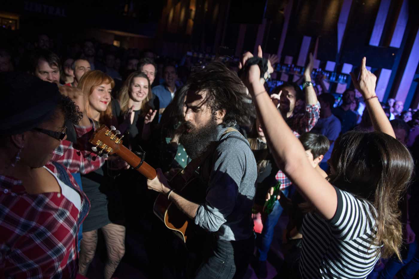 Creo que es buen símil de lo que es tu música, o al menos lo que ha supuesto para mí. No soy fan pero reconozco en ti cierto magnetismo envolvente que te lleva a empezar con una “Cosecha” que parece más un cierre que el inicio de un concierto. Pero esta calma que nos regalaste duró lo poco que tardaste en darle caña al asunto con una “Escupe Fuego” de la que no hay que sonrojarse si se dice que recuerda a los mejores Pereza o Quique González. Es sincero, no me imagino mejor banda sonora para una tasca de bar a punto de echar el cierre. Continuaste tu directo desplegando el nuevo disco por medio de canciones como “Un día épico”, “Galicia calidade” o una “Hula hula” que me demostraron que sí, que tienes una buena legión de fans que, a pesar del rechazo que te produjo la gratuidad del concierto de ayer, te hubieran acompañado igualmente en la noche pamplonesa si se hubiera dado otra situación. Se iba acabando el tiempo de tu directo radiofónico y decidiste sacar la artillería con esa “Mezcalito” de riff pegajoso, y una “Señor tosco”, dedicada al periodismo más rancio de este país, que esperemos que no sea este. Una “Carbura” bien coreada. Y una “Mátame camión” cuyo final ya conocemos los dos.