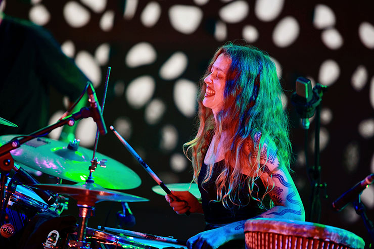 Respiramos al ritmo del piano de Víctor en “Clamor”, con Ángeles recitando cada verso, hasta desembocar en el canto del fragmento de los “Los cuatro muleros” y, sin pausa, una nueva bruma sonora, resplandeciente y expansiva, nos rodea y cala hasta los huesos… “No, / no me lo claves, / no”, pero ya es demasiado tarde, el “Puñal” entró “en el corazón como un rayo de sol” y ahí se queda, con la voz de Ángeles sanando y abriendo heridas al mismo tiempo, fluyendo y volando hacia otra galaxia, entre “tirititiritiris” y ayeos interestelares, hasta alunizar bajo los ritmos tribales que marca Gloria y volver a despegar en “El paso de la siguiriya”, esculpiendo el aire, quejío a quejío, “entre mariposas negras / (...) junto a una blanca serpiente de niebla”. Tras vaciarse por siguiriya y dejarnos “el corazón de plata / y un puñal en la diestra”, ovación y Ángeles se levanta de su silla y sale de escena, con el tridente, Víctor, Gloria y Javier, “like a rolling stones” espaciales, haciendo que mueran y nazcan estrellas en la noche, fundiendo el final de la pieza con la psicodelia de mil colores de “Paisaje”.