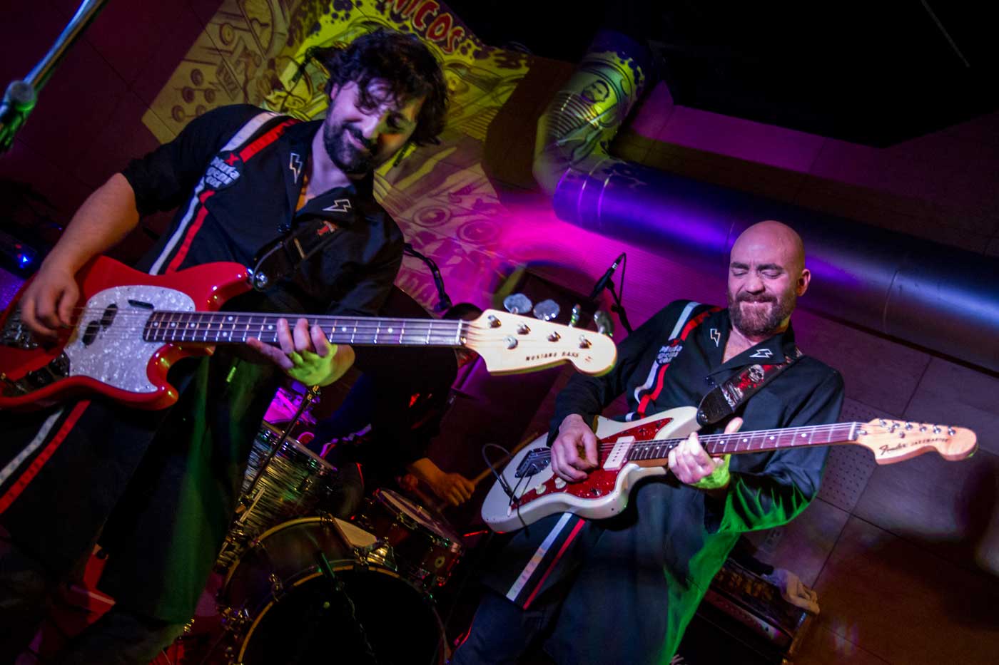En todos los conciertos del domingo, se proyectó un acompañamiento visual en la pared del fondo. En el caso de los riojanos, se utilizó la portada de su disco de 2017 "¡¡Mutan!!", disco en el que basaron su repertorio. En esa portada, los Mutagénicos son cuatro, cinco si contamos al profesor chiflado que está apunto de fuzzilizarlos. Para esta ocasión, sin embargo, actuaron en formato powertrío o trío a secas, aunque “power” lo que se dice “power” sí que demostraron tener. Ataviados con un uniforme que hacía pensar en la ciencia más estrambótica o en los mecánicos de Herbie (aunque también se oyó a alguien gritar “¡esos churreros!”), empezaron desde lo más profundo del bosque, con lobos aullando y la sintonía de “El hombre y la tierra”. Con ese grito atávico, arrancaron salvajes pero con material añejo, abriendo con instrumental, luego “Quiero fumar”, a la que siguió “Contigo” y otras cuantas hasta que llegaron al nuevo material para tocar “Darlo todo”, una canción con mucha y enérgica batería, donde precisamente canta el baterista, y que decoran con palmas. Volvieron atrás en su discografía para concentrarse en una canción que definieron como difícil, el instrumental “Freak Show”, con el guitarrista dándole también a la percusión y el bajista a la maraca. “Mientes más que hablas”, también de ¡¡Mutan!!, dedicada a cierto personaje de actualidad, la sucedieron con su versión de la canción de Los Nikis “Saturno es aburrido”, donde meten más matices y contrastes, incluso oscuridad; oportuno en un concierto, por otro lado, muy luminoso, fresco y dinámico. Tan luminoso, fresco y dinámico que hasta se animó Tomasito, el robot bailarín que apareció por el fondo de la habitación para cruzarse la platea azuzando al público. Sobre el escenario, los Mutagénicos perdían protagonismo mientras ponían la banda sonora con una “Soy un robot” que sonó categórica como en el disco, una canción con mucho fuste, aire de pub rock y un riff a lo Wilko Johnson que hizo bailar a Tomasito y a muchos otros. “Mutagenízate” vino luego y con tanto cambio en la organización del ácido desoxirribonucleico (tenía que hacerlo, nunca me imaginé escribiendo esta palabra), conseguí que se me olvidara que la noche anterior me quedé dormido viendo Aniquilación, donde había mutación para parar un carro, por cierto. Volviendo a lo que estábamos, terminaron con el subidón de “Loco del garaje”, sin espontáneo, pero con la misma mordiente. Mencionan en la letra a los Kinks; a ellos suenan. El bajista abrió esta última canción poniendo inhiesto su instrumento, lo que me sirve, al mismo tiempo, para cerrar esta primera crónica mencionándole en exclusiva porque (opinión personal) triunfó y retumbó por un local que, por otra parte, parece la despensa del Nostromo, y con las referencias mutagénicas a Saturno, creímos, por un momento, que la teniente Ripley estaba a nuestra vera.