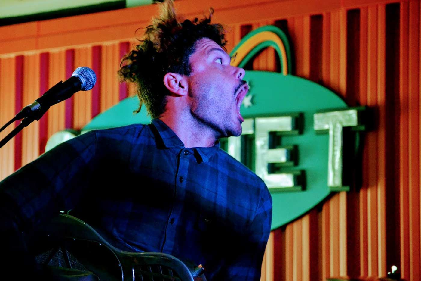 El domingo, Ash Grunwald (foto inferior y encabezado) cerró en Bilbao, con un concierto matinal, su gira peninsular. Grunwald tiene jerarquía y peso en su escena nacional, Australia; en dos lustros y pico de carrera, camino ya de la grabación de su décimo larga duración, ha tocado también en Europa, Estados Unidos y Canadá. Tiene muchos sellos en el pasaporte, seguro. Sin embargo, por aquí, para muchos, y me incluyo, permanecía como un nombre desconocido, de los que tienes que teclear en google para después asombrarte de todo lo que vas descubriendo. Se presentaba acompañado al bajo de Fernandito Beaumont, largo como el mástil de su instrumento y de sonrisa difícil pero amistosa, y Joel Purkess, baterista, más risueño, amable con los platos, capaz de tocar rápido con los brazos cruzados y al cargo de una batería nacarada que compartirían las dos bandas del día, si no me confundo. Como estaba allí abandonado, pegado con celo en el suelo cuando entramos, fotografié el setlist para saber de antemano qué iban a tocar y te puedo decir que no me sirvió de mucho, porque invirtieron el orden del listado de canciones a su gusto y capricho. Primero, empezaron en formato power trío, con Ash Grunwald de pie, esgrimiendo una Gibson de cuerpo hueco que, por supuesto, tocaba sin púa, moviendo los dedos de ambas manos por el instrumento como si fuera un libro de poesía escrito en braille. Así arrancaron y así siguieron, sin bajarse del pedestal, viendo desde la altura la planicie de raíces que sobrevuelan los drones del futuro: es decir, mezclando tradición e innovación, siempre sustentados en la pericia instrumental de los tres y en la hondura y relieve de la voz de Grunwald. Después, llegó la parte sentada, cuando Grunwald agarra un dobro metálico que parece sacado de una escena de Mad Max. En la banqueta, encorvado para arrastrar con soltura el slide por el diapasón, se le nota cómodo. Destacó, para mi gusto, “You Ain’t My Problem Anymore”, una de las nuevas canciones que le han devuelto a la luz pública dos años después de la publicación de NOW, su último disco. La otra canción recién estrenada, “Hammer”, que, como el mismo Grunwald explicó, ha sonado recientemente y para la ocasión en la radio estatal, la tocaron de pie. También con la sonoridad del dobro, tocaron “Mojo” y la versión del “Crazy” de Gnarls Barkley que le dio, en su momento, una buena dosis de popularidad en su país. Fue, además, una versión sugerente y efectiva, que sorprendió por la rapidez y energía con la que la ejecutaron. Volvieron a la Gibson y tocaron “Open Country” de su álbum NOW que sonó más orgánica y personal que en la original grabada, igual de bailable y fibrosa, pero donde se nota mucho la tonalidad que imprime Ian Peres de Wolfmother. Por destacar más, en los momentos de pureza y arraigo, se lució versionando el “Crossroads” de Robert Johnson y en el homenaje al que llamó su héroe personal, Howlin’ Wolf. Dos nombres que dejan bien claro de dónde viene y nace la música de Grunwald; pero, después, por ejemplo, es capaz de repasar un clásico como el “Ain’t No Sunshine” de Bill Withers y jugar con la composición, deconstruirla, interactuar con el público, y regresar a la delicadeza y la introspección tras pasar por un momento de conexión instrumental, en este caso, un diálogo de traste en traste entre bajista y guitarrista.