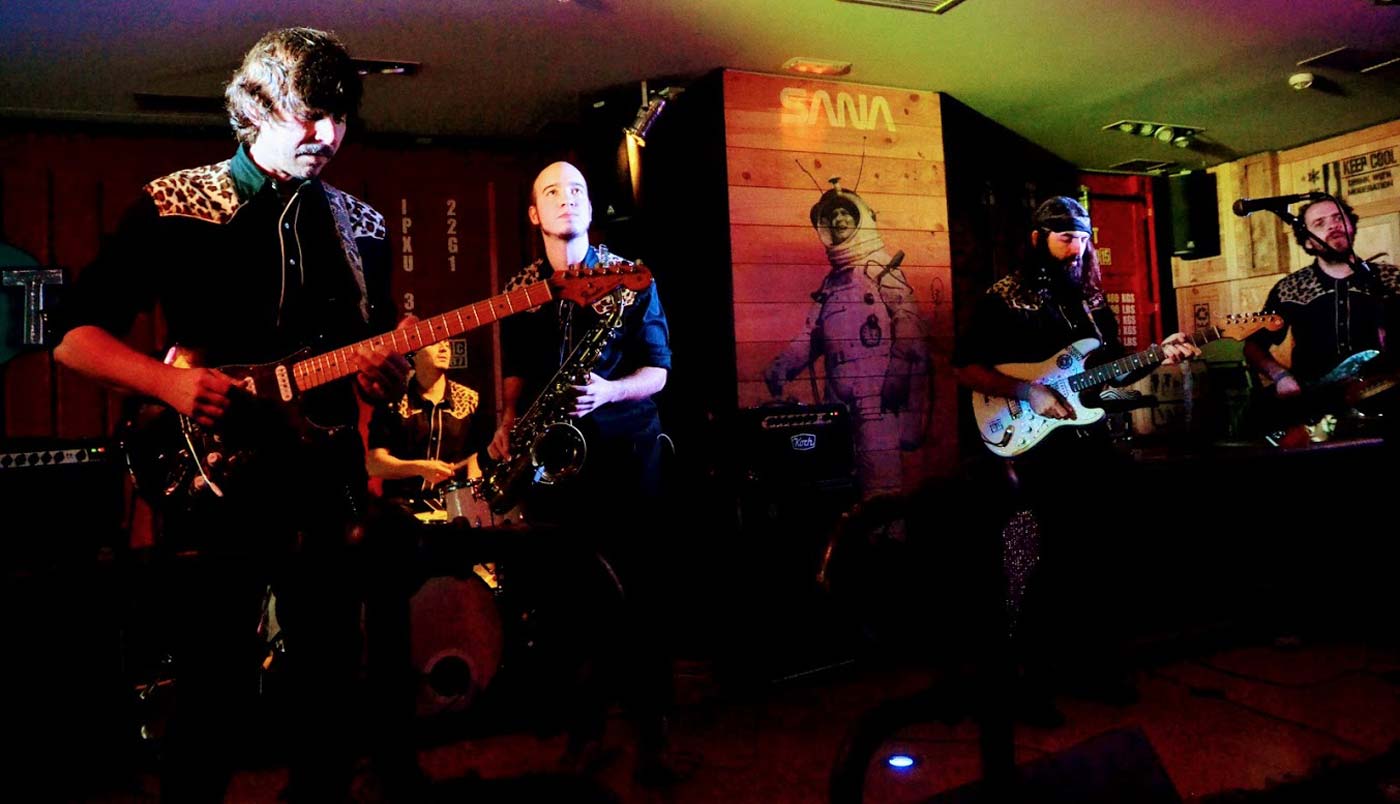 Necesitamos unos segundos, solo unos segundos, para acostumbrar la mirada y la apreciación al nuevo formato físico sobre el escenario. Y es que los Durango 14 (foto eran más en número y en dinamismo, y se colocaban en línea, como si fueran los siete magníficos pero sin cabalgadura. Y la imagen está bien traída porque así empezaron, empolvando el suelo del Satélite T, evocando puestas de sol en el desierto, y haciendo rodar estepicursores por el escenario. Ellos se etiquetan como surf & roll espeso. Y no te llevará mucho tiempo averiguar qué es lo que quieren decir con eso: están tan cerca de Dick Dale como de Josh Homme. No seré el único que haya asistido a un concierto de ellos y a mitad del mismo aproveche un momento para susurrarle al oído a su compañero o compañera: “pero esto no es surf instrumental”. No, no lo es. No lo es del todo. Tienen momentos de playa californiana y de folclore fronterizo, casi rozan el pasodoble pero pasan de repente a Kyuss y a riffs más indies, y a puro rock and roll enérgico y lozano. Van uniformados con camisas de estampado felino y tienen coreografías pausadas, pero lo que más destaca es la nitidez y contundencia con la que se acoplan todos los instrumentos: el saxofón con protagonismo, la parte rítmica, y dos Fender stratocaster que se buscan, se encuentran y se reparten la prioridad. Sobre todo, luce como son capaces de imprimir carácter y personalidad, pujanza y persuasión, a todas sus canciones. En mi opinión y en resumen, Durango 14 son una banda instrumental que sabe pasar del aire a spaghetti western al regusto stoner sin abandonar el rock and roll y mirando siempre de rebufo al surf. Algo que parece fácil de decir pero difícil de conseguir.