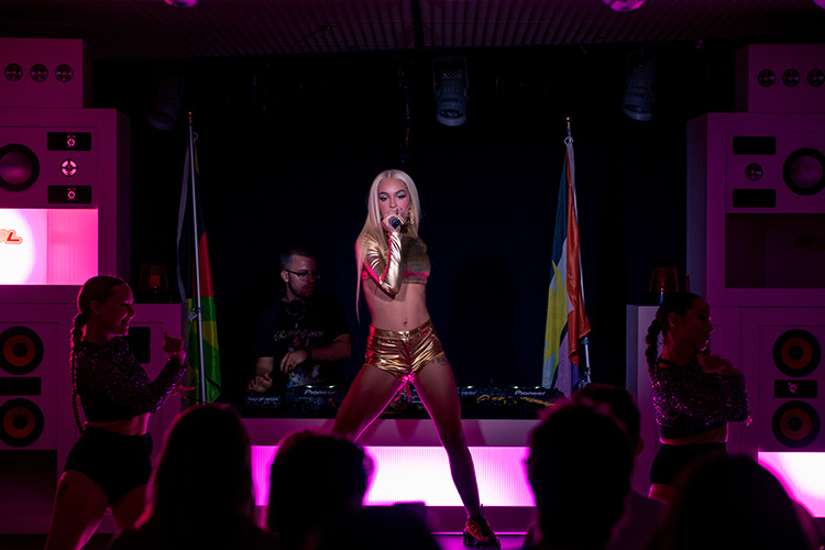 En la pequeña sala podemos ver montado un DJ Set con el logo de la artista, algo que nos recuerda a esas añoradas noches de discoteca de la antigua normalidad. El Dj empieza a pinchar la música y saltan las alarmas. A continuación aparecen entre el público las dos bailarinas que acompañarán a Alba Farelo durante todo el show. Una vez están en el escenario, Bad Gyal aparece lista para encender la mecha, mientras es recibida con una gran ovación.