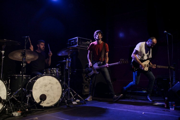 Sin respiro, enganchan con el mantra de “Gordintasunaren Otordu Luzea”, desnudando la osamenta de su propuesta con esa estructura repetitiva que podría alargarse hasta el infinito si la tensión no tuviera limitación. Esto necesita una pausa, pero tras unos sentidos agradecimientos, vuelven a la carga con el lánguido comienzo de “Alderantzizko Magia” y esos parches resonando en el vacío alrededor de un bajo post-punk, para implosionar con estallidos de guitarras en su parte central y jugar con las dinámicas durante casi diez minutos. Osinaga sufre con la bola de sonido que se genera alrededor de su ampli, pero Manterola no le quita ojo durante toda la actuación y le mantiene a flote en la marea, mientras los restantes cuatro músicos son una boya en el centro, un átomo cuadrado alrededor del cual orbitan el caos a las seis cuerdas y las voces que escupen las distópicas letras de Martxel Mariskal.