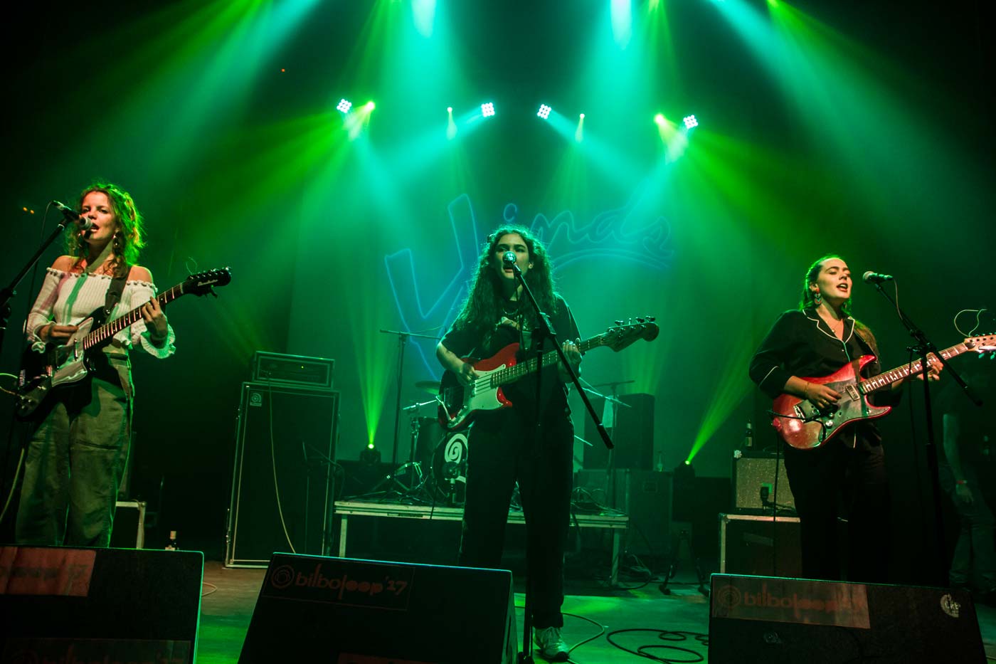 La sala está ya en plena ebullición (de hormonas adolescentes), a punto de comenzar el bolo del cuarteto madrileño Hinds. Intentamos zafarnos de los prejuicios: ¿Se ha cebado la crítica con estas chicas, simplemente por ser mujeres y jóvenes? ¿Es para tanto el fenómeno Hinds? Suena Hot Chocolate con su clásico y canalla “You Sexy Thing”, que introduce a la banda. Funden “Garden” y “Fat Calmed Kiddos”, ambos de su álbum debut Leave Me Alone (2016). Esta es la tercera vez que actúan en Bilbao, recuerda su cantante, Carlotta Cosials. La primera fue en el BBK Live, y la segunda, “fue muy raro, tocamos en una sala a las tres de la mañana…”, rememora.