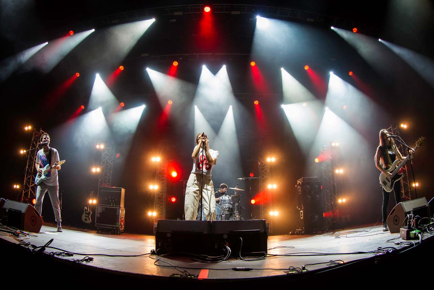 Belako (foto inferior) comenzaron su set potentes, con mucho volumen y ante bastante público, se notaba que era uno de los alicientes del día en un cartel, el del viernes, que carecía de algún nombre que atrajese al gran público. Estuvieron super activos sin parar de saltar y botar sobre el escenario. A cris se la vio muy suelta y disfrutona sin tener que tocar teclas, y Josu no paro de levantar los brazos para animar a la concurrencia. El set empezó en lo musical un poco plano pero se empezó a venir arriba con temas como “Render Me Now”, “Hunted House” o “Sea Of Confusion” que si que brillaron como debían y demostró lo rodados que van con detalles como, Josu rasgando la Strato con una botella de cerveza, dándole un trago y fusilando el riff para terminar. Cris llevaba una camiseta blanca con el numero 86 estampado, antes de terminar su set, comentó que es el numero de victimas que llevamos de año por violencia machista este año y leyó un poema que decía que para las mujeres no hay paz, algo que es necesario reivindicar. Buen bolo y la gente aplaudió contenta, el final de set ruidista.