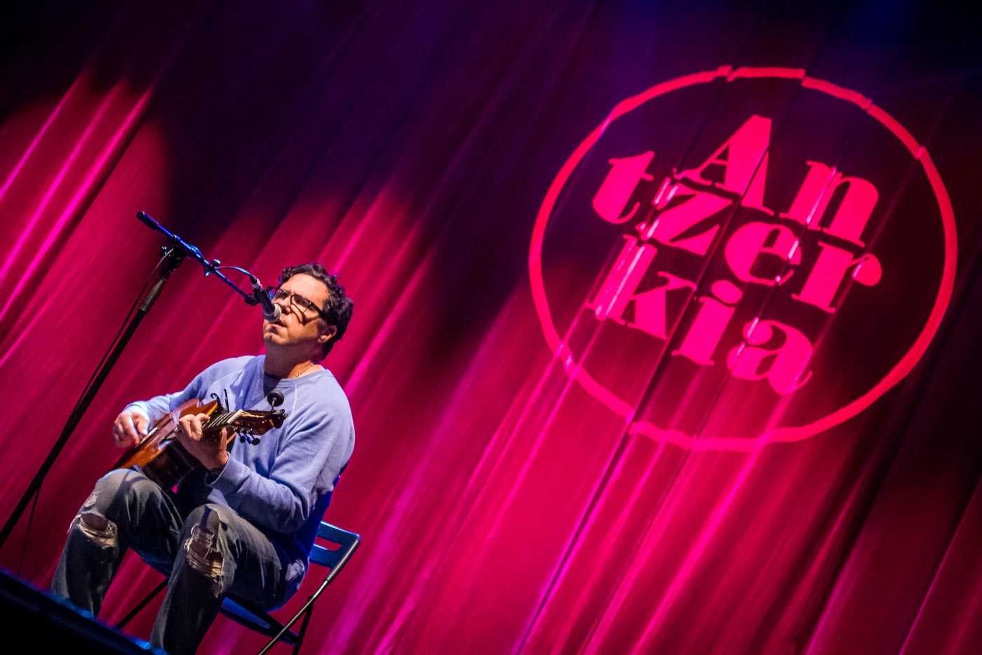 Damien Jurado (foto inferior) lo tuvo complicado. Tuvo que lidiar con la nueva ubicación del escenario Antzerkia (Teatro), un entorno menos agradable que en años anteriores. El murmullo infernal proveniente de una barra cercana, con el añadido del ruido de botellas de vidrio cayendo en un contenedor, deslució su intento de concierto acústico. No obstante, tuvo tiempo de recrear historias repletas de una calma mágica como "1973", con la inestimable ayuda de su guitarrista acompañante, quien ofreció una masterclass de sutileza. Tras unos cuarenta y cinco minutos, el cantautor de Seattle, visiblemente enfadado, dijo "Me tengo que ir". Y se fue. La maldición de Damien.