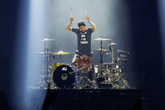 El caramelo de la noche, como no podía ser de otra manera, viene de la mano de Travis Barker, elevando su plataforma varios metros del suelo cuando empieza a sonar ‘Down’, tocando a modo ‘speed run’en la segunda retomada de “Happy holidays you bastard” e incluso con la cara tapada con una toalla buena parte de ‘Violence’ y demostrando de nuevo porqué es la celebridad de las baquetas.