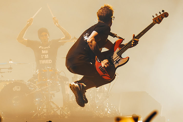 No faltan cañones de fuego y pirotécnia varia, hinchables gigantes con la iconografía del grupo y unas pantallas colosales que visten un escenario pensado para brillar en grandes arenas. Así, a golpe de fogonazo, con la épica "lso Sprach Zarathustra, op. 30’" de Strauss de fondo, ‘Anthem Part. Two’ impacta de lleno en esta escena algo fastuosa. Porque más allá de los fuegos artificiales, Blink-182 son esa actitud gamberra de patio de instituto. Por eso esas bromas escatológicas que te hacen llorar de la risa, no pierden fuelle cuando entonan su clásico ‘Family Reunion’. Tampoco cuando el propio Mark Hoppus reconoce este pacto de teatralidad apelando a los “emokids” que cerraban de golpe la puerta de su cuarto enfundados en pantalones pitillo para escuchar ‘Stay Together For The Kids’. Por unas horas tanto banda como público hacemos ese pacto de ficción y no rendimos cuentas a las canas ni al lumbago del dia siguiente.