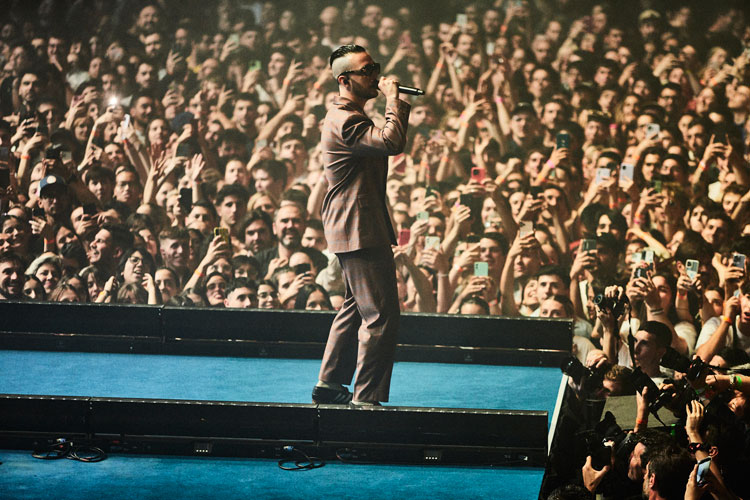 “Sin cantar ni afinar” es una obra de teatro interactiva, una celebración de la música de raíz y sobre todo del arte de lograr que las cortinas estílisticas se corran sin hacer ningún chirrido: del flamenco y el pasodoble al hip hop más hijo de puta sin escalas y con un avión de malvavisco que aterriza sobre una enorme cortina de terciopelo. El repertorio –arropado por un sonido sencillamente espectacular– no falla en ningún momento y eso también parece ser mérito de un plan maestro, de la consagración de la idea de convertir a C Tangana en una estrella global solo a base de aplicar la calidad máxima posible en todos los aspectos. Porque “El Madrileño” –la base de repertorio del show, un disco completamente entregado a las mieles de las grandes discográficas con su presupuesto generoso y su influencia irresistible–, es tan comercial y descaradamente ganchero como genial. Al menos eso siente el público argentino convertido en un coro a perfecto tempo cardíaco.