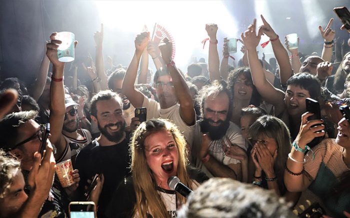 El año pasado tuvieron que suspender por problemas de salud de Yago y hoy salen, como siempre, a todo gas, demostrando una vez más que hay pocas bandas nacionales más solventes y divertidas en directo, Mujeres rules. Disfrazados con cajas de cartón con ojos en las cabezas, el sol se va despidiendo y “Cae la noche”, seguida de una balacera de hits pegadizos que invitan al pogo continuo, con el omnipresente bajista Pol Rodellar (firma el arte del festival este año, cartel, escenarios y merchan) volando entre el público a las primeras de cambio. Me encuentro a Isa (Triángulo de Amor Bizarro) y me comenta que andan preocupados por el viento… Sigue la fiesta con “Dije Fácil”, “Besos”, “Rock y amistad” y “Vete con él”, hasta llegar a “Un sentimiento importante” en el que nos dejamos las gargantas y aferramos para que no termine… Pero termina y anuncian que hay que suspender por el fuerte viento que ya comenzaba a tirar cosas y seguía creciendo… Desalojo y horas inciertas que, como conté al inicio de la crónica, presagiaban la cancelación definitiva… Pero no, tras el parkineo y fiesta callejera, se hizo el milagro, porque el Canela Party es una movida gordísima a prueba de huracanes.