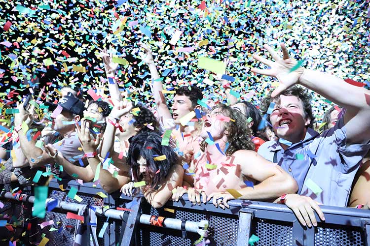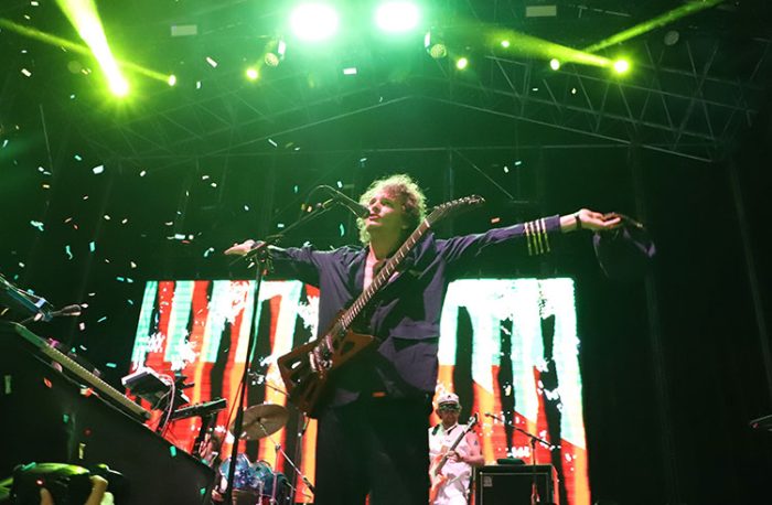 Sobrepasamos las doce de la noche y, con previo aviso de la organización (en continua actividad por redes) vuelve a abrir las puertas del recinto, con desfile de disfraces y alegría colectiva que no cabe en el ambiente. No se sabe como seguirá exactamente la meteorología, así que hay que salvar los muebles y readaptar rápidamente los horarios, sacrificando irremediablemente algunas bandas… Pero lo primero es lo primero: los australianos King Gizzard & The Lizard Wizard salen a escena como pilotos/comandantes y azafatos de avión, y volamos por los aires sin necesidad de motor ni viento, desde el primer segundo, nosotros, las orcas Gladis que plagan el recinto, embarcaciones y todo el atrezo y disfraces habidos y por haber. Puro fuego en un show reducido por lo ocurrido: del rugido y tromba de riffs de “Gaia” y el “Motor Spirit” inicial que abre el cielo en dos, a un “Mars for the Rich” meteórico al que parece que no vamos a sobrevivir… Pero sí, a duras y alegres penas, con Stu Mackenzie y el resto de cabezas del dragón australiano escupiendo llamaradas sónicas y ametrallándonos sin piedad en “Converge” y la compañera de nuevos surcos “Witchcraft”, enlazando géneros y libérrimas jams en una metamorfosis continua y apocalipsis controlado. Psicodelia sesentera en una “Am I In Heaven” que termina por acelerar bajo una lluvia de confeti y fusionarse por momentos con pedazos de la grandiosa “The Dripping Tap”. La montaña rusa sigue ganando velocidad y tomando giros imposibles, pasando por los rapeos de “The Grim Reaper” y una nueva jam intergaláctica que desemboca en la soulera y falsa calma de “Magenta Mountain”, en la que tomamos, por fin, un poco de aire. Nos rematan con uno de sus himnos más identificativos, una “Rattlesnake” que vuelve a sumergirnos en una locura colectiva de la que no queremos despertar.