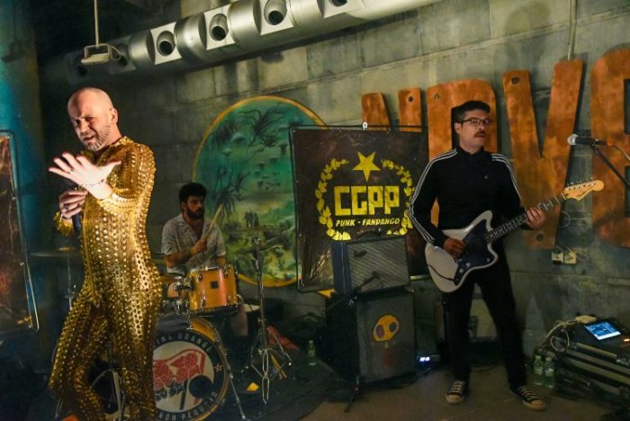 Hay un chaval entre el público e interactúa con él. “Tienes pelazo, cabrón,” le dice, a lo que este le responde llamándole envidioso. No se lo toma a mal: “Toma, claro, ¡cómo no voy a tener envidia!” Y, habiendo intimado con el chaval, le utiliza para hacer la review de la cecina. Cuando le da su aprobación, Verderón lo celebra con un sincero “Quieras que no yo ya marcho contento para casa”. La cecina se ofrecerá en comunión, aunque ya advirtió de que el punk fandango era “laico”, y a los que estamos detrás nos anuncia que probablemente no nos llegará pero que ya lo hará por “osmosis”. Dirige la eucaristía a pie de público y, efectivamente, no llega hasta el fondo, pero, en otro momento del bolo, ya con el mono hecho unos zorros, sí lo hará, que aparece por la puerta principal sin que nadie lo espere, después de coger el atajo de la calle, y nos da un susto de muerte. De la misma, eso sí, se vuelve. Pero, a lo que iba, que sí, que cantan “Condones de cecina” y vuelve a felicitarnos por el baile y ya llegamos al último pase, que lo dejan bien arriba con “Arroz con costilla”.