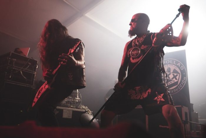 Hasta yo me quedo sin aliento ahora, contándolo. No sé cómo ellos resisten ese ritmo de calestenia y greguería. Porque siguen: “A.M.V. (Agrupación de Mujeres violentas)”, “Ultramemia”, “Ellas denunciaron” y “De cacería”, que terminan todos disparando al bajista, J. Al Ándalus. Los cuernos anuncian que llegamos ya al clímax. Sagan Ummo se pone en el centro y nos consagra: “El día de la bestia”. “No sabéis lo que os perdéis al no visitar los templos”, comenta un Strawberry al que no se le agota la ironía fina, que se afila al máximo con “Mi reino por un poco de caballo” y ya hemos llegado al final. Dan las gracias y arrancan una “¿Qué dice la gente?” que queda aún más tajante con el acompañamiento del público y la participación de un encapuchado espontáneo que ondea una bandera de los Churrería. Si no los conoces, ya me sorprende, pero, prepárate, que acabarás haciéndolo.