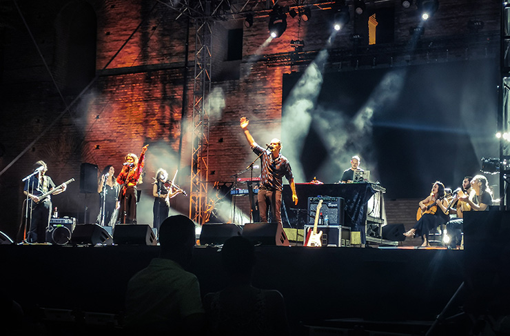 De la arrebatadora Buleríâ del aire acondiçionao en la que se dejan la piel sobre las tablas (echamos en falta el vozarrón de Miguelito García), a una En bûcca y câttura que es puro compás y jolgorio, taconeos bajo una lluvia sintetizada que no cesa. Y es que, por muchos “Vete ya de aquí, vete ya de aquí”, Califato ¾ ha llegado para quedarse y suena y resuena bien claro en AÇeitunitâ negrâ: “No nos vamos a ir, / somos andalusí, /no nos vamos a ir”. Sonoridades de todas las culturas que pasaron por esta tierra nuestra, de ellos, de todos y de nadie. Vientos arábigos y raíces flamencas de mil colores que se filtran en cada interpretación, de Camino de Aghmat o a la Alamea por alegrías, pasando por el subidón electrónico revisitado de La puerta de Le Parody (se acuerdan de Sole, que toca en pocos minutos en Nocturama) y por la suya propia, “La puerta de la Cânne”, en la que la capital hispalense recupera por sevillanas “califales” la feria de abril perdida, dibujando en esta noche de farolillos y neones, entre palmas y sintetizadores, esa “muralla invisible que protege nuestro amor”, con “cuatro pavos reales vigilándonos a los dos”.
