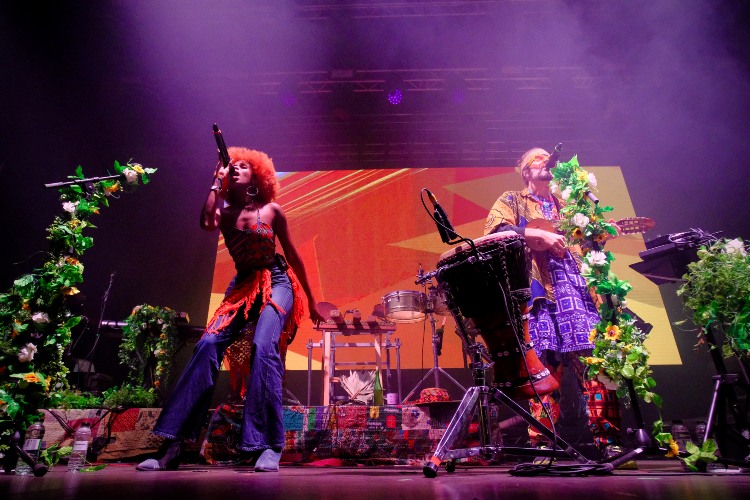 Los siguientes en escena serían los ingleses Crystal Fighters (foto encabezado). Que cual celebración pagana de cambio de estación, venían a hacer lo propio con un espectáculo lleno de amor y espiritualidad, aunando sonidos de la txalaparta, con ukeleles, y la base electrónica que siempre ha caracterizado a esta banda tan ligada al folclore vasco. Presentando “LIGHT+”, la banda demostraba seguir teniendo esa esencia que les caracteriza con canciones como “We Got Hope”, “Love Is All I Got” o “Love Natural”. Con una impecable interpretación, e implacable en el caso del batería, el patio del antiguo colegio de Cascante fue invadido por buenas vibraciones y energía positiva desde el principio hasta el final de su show en directo, dejando el listón de esta edición muy alto. Nos despedíamos de la jornada del viernes con una sesión a cargo del DJ pamplonica, afincado en Madrid, DJ Moderno.