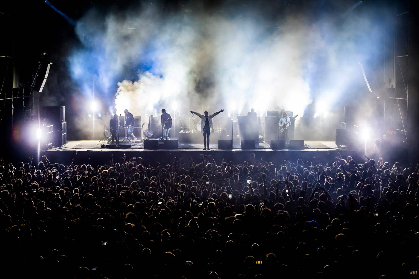El sábado por la tarde, Jaime Buenaventura y Cooper fueron los más madrugadores. Al primero lo conocemos por el single “Cansado de escribirte” y tuvimos la oportunidad de escuchar alguna canción más, de las que darán forma a su primer larga duración. A los segundos, ya se les echaba de menos. La vuelta se llama Tiempo, temperatura, agitación. Y allí estaba su fiel legión de feligreses, lista para escuchar las novísimas “Ya llegó el verano”, “Islandia”, “Graciela”, “Infinito” y “El último tren”, mezcladas con las clásicas “Cerca del sol”, “Canción de viernes” o “Rabia”. Sin olvidar la herencia de Los Flechazos: “Atrapado en el tiempo”, “A toda velocidad” y “Luces Rojas”. Todo, en un directo impecable, que resiste a modas, cambios de formación… Es solo pop, pero de muchos quilates. Muy diferente fue la propuesta de Shinova, grupo que ha mutado hacia el indie más comercial tras su fichaje por Warner. Después de Cooper, resultó chocante oír canciones como “Qué casualidad” pero la banda consiguió calentar el magno escenario Estrella Levante con un público que le sigue y crece día a día. Llegó el momento Izal. El directo es la mejor Autoterapia de una banda que no olvidemos también tocó muchas veces para veinte personas. El éxito es tan difícil de digerir como el fracaso diría aquel y en Murcia se enfrentaban a la tarea de demostrar por qué es la banda que todos quieren en su cartel cueste lo que cueste. Nueva puesta en escena con una escenografía a lo Saul Bass y sobre el papel un repertorio largo como la figura de Mikel que miraba al horizonte y descubría a gente bailando a un kilómetro. De Copacabana a Murcia de nuevo con Neuman y Viva Suecia. Bandas intensas y taciturnas, sí. Pero que saben situarse en el punto justo para no resultar un tostón, con canciones sobradas de gancho. Paco Román lo demostró en “Boystar” o las más añejas “Bye Fear/Hi Love" o “Hell”. Y a lo de Viva Suecia, pocos adjetivos hay que ponerle a estas alturas. Están destrozando récords con apenas un disco. Solo diremos que pocas veces se había visto una comunión tan perfecta con el público a este lado del Segura.