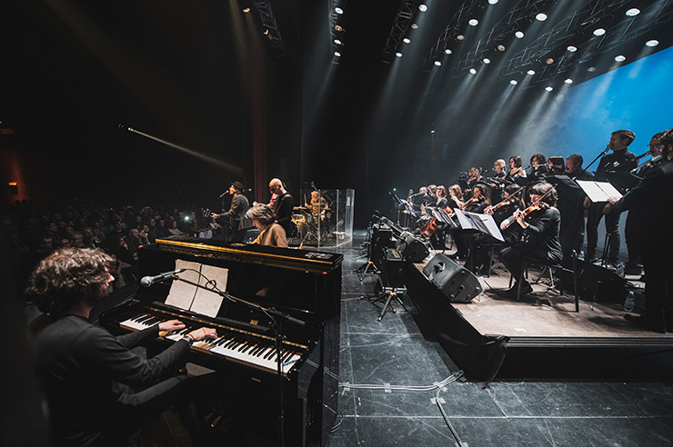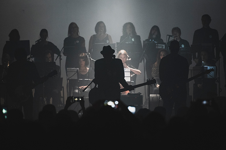 En este caso, el recorrido poético, hecho canción, sinfonía y carne, a través de célebres episodios bélicos del siglo XX. Este disco es especial: Lagartija Nick lo interpretaron íntegro, de principio a fin, con el soporte del pianista David Montañés, y el Coro y Quinteto de la UGR. Cerca de una treintena de personas en escena, cañoneadas desde el cielo por innumerables focos de luz pálida. Y ahí, en los claroscuros, estaba la banda liderada por Antonio Arias. Resultan incontables los conciertos de sobresaliente de Lagartija en su ciudad. Y eso que hablamos de una criatura en constante mutación, alérgica a la zona de confort y con más de un autosabotaje a sus espaldas en estos treinta y pico años. Pues bien, la puesta de largo de Los cielos cabizbajos será recordada como una velada única, en la que sucedió algo insólito, logísticamente impensable, de una belleza abrumadora. La imagen de una formación en cénit creativo, en estado de gracia esa noche, saltando sin red.
