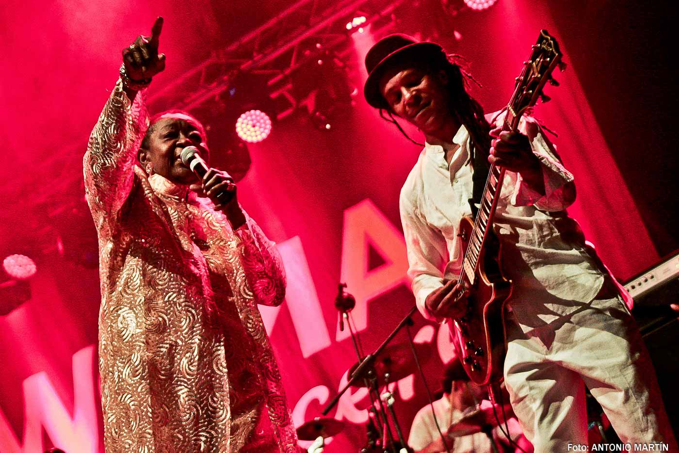 Pero aún nos esperaban otras dos empoderadas mujeres en esa noche. Primero la antes mencionada Calypso Rose (foto principal). Tiene casi ochenta años y una historia de vida digna de un documental. Pero en escena destilaba una tremenda energía vital y simpatía y aunque se movía-bailaba lentamente, lo hacía de una manera que te atrapaba. Refrendada por una completa e impecable banda, puso a bailar a toda la Plaza Mayor con esa mezcla de calypso, cumbia, ska, reggae, soca y mento. Empezó reivindicándose con "I Am African", tiró de soukous con "Zoom Zoom Zoom" y con "Leave Me Alone" (el tema que hizo con Manu Chao) fue inevitable no caer rendido a su ritmo. Más tarde con el reggae de Calypso Blues hizo que todo el mundo coreara ese pegadizo estribillo de “wayo, wayo” y hasta se tomó un respiro para que la banda se luciera. Con el ska de "Far From Home" convirtió la Plaza Mayor en una pista de baile, cerrando la noche con la gozosa "Fire In Me Wire". Una actuación que quedará para siempre en la memoria de este Womad.