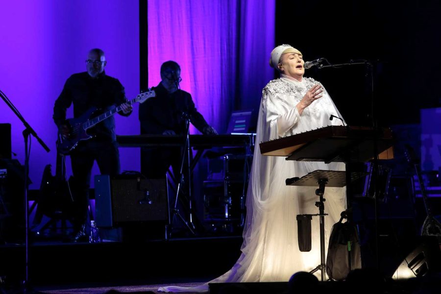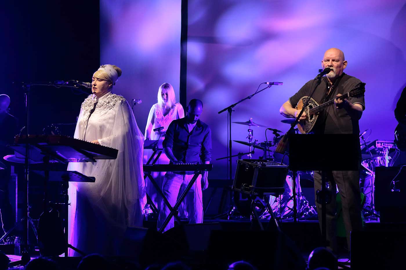 Lisa Gerrard y Brendan Perry se presentaron frente a nosotros en un escenario sobrio, con dos pantallas –una delante de la otra– que creaban profundidad y en las que se proyectaban texturas, y luces minimalistas. Les acompañaban seis músicos, capaces de amplificar la magia que surgía del alma de la australiana –ataviada con un elegante turbante y una túnica blanca élfica– y del inglés –algo más terrenal, vestido de negro de cabeza a pies–. Todos ellos nos tomaron de la mano para hacernos recorrer los paisajes que dan forma al riquísimo mundo musical e interior de Dead Can Dance.