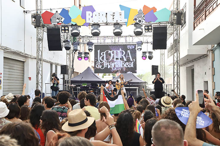 No llegamos a tiempo para ver a Nuria Herrero en el concierto inaugural, pero cuando nos acercamos al Escenario Convento aún resuena el eco de su universo de percusiones y raíces latinas, africanas y cubanas, el canto a la memoria y la voz de las silenciadas y silenciados. Seguimos la música y encontramos en el escenario Canarias, al fondo de una estrecha y larga calle, a La Otra & Jhana Beat, que nos reciben arrojando al aire versos sentidos y comprometidos, demostrando que no hay que cambiar el paso para pasar de lo íntimo a lo colectivo. La música y “la poesía no es un lujo”, sino, como afirmó Audre Lorde, es algo totalmente necesario, combatir desde el arte las terribles injusticias y crímenes del mundo, con Palestina siempre presente. Mecen la tarde y curan heridas con esa mágica “brisa que viaja al cantar” en temas como “Vuelve” o el flow enérgico y necesario de cantar para recordar que “Tenemos poder”, tema en el que Isa, tras fallar la tecnología, sin base electrónica, deja que su canto vuele a capella, porque, como decía El Cabrero, “a la voz no hay quien la pare, ni rejas ni paredes”. Y de la canción de autor y el folk más preciosista y embriagador, pasamos a la rave más reivindicativa y festiva, con Jhana Beat acelerando el pulso rítmico de la tarde, ráfagas de beatbox incluidas. Hasta llegar a ese “dolor que puede ser la pimienta de las alegrías”, despedida sanadora que funde cumbia con techno, dejándonos la primera marca en el pecho nada más aterrizar en Boreal.