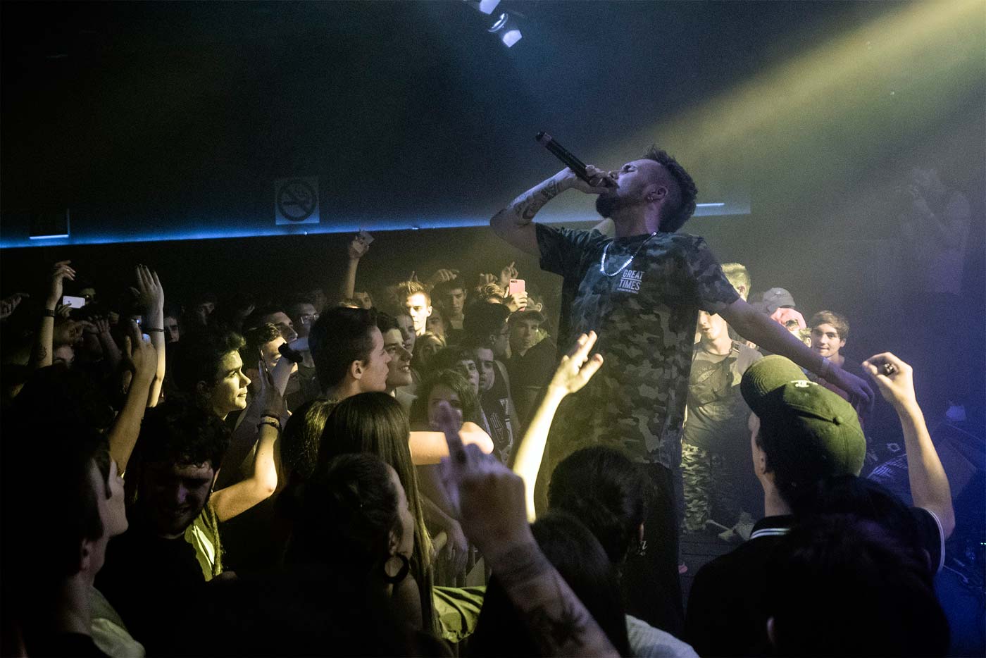 Denom (foto inferior) salió a machamartillo con ‘Girando el tambor’. Entre efluvios de cannabis, la pimpollada vulneró masivamente la ley Antitabaco y jaleó sin descanso al rapero mientras caían ‘Desde cero’, ‘Cuando no estás tú’, ‘Sangrando’ o un par de piezas que interpretó a capella porque fallaron los instrumentales. Especialmente celebrados fueron ‘Historia de amor de barrio’, en la que sonó la voz pregrabada de Fyahbwoy, y sus acercamientos a los ritmos magrebíes y flamencos en ‘Elegancia y constancia’ y ‘Quiéreme mejor’. También sonaron ‘Flacos y nerviosos’, su colaboración con Jarfaiter; ‘Una parte de mí’, con tiernas rimas dedicadas a su padre, y ‘Humo’, perfecta para tan brumoso recinto. En el tramo final el madrileño concentró ‘Tengo una bala’, ‘Bang Bang’, ‘Veneno’ y ‘Uno de esos días’, algunas próximas a la sonoridad del trap actual. El concierto concluyó con el ‘selfie’ colectivo de los artistas junto al público de fondo, una imagen que después circuló de Instagram en Instagram por los incontables teléfonos móviles que funcionaron a pleno rendimiento durante toda la velada.