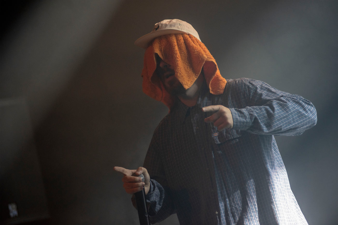 Ya el sábado, el humor presidió la tercera y última jornada de Donostikluba, que comenzó con el (des)concierto de Sad Nigiri (foto inferior), el artista guipuzcoano antes conocido como Sad Mirri. Precisamente, los traumas de infancia y el payaso Mirri parecen el motor de sus extravagantes canciones, en las que lo mismo vincula a ‘Goenkale’ con el portal porno ‘Brazzers’ que cita a series para niños como ‘Rugrats’. No faltaron las alusiones a C. Tangana ni a Cecilio G. y hacia el final de su performance encadenó una desopilante versión del ‘Your Song’ de Elton John con una andanada de death metal y un vídeo de una vieja bailando al son de ‘La cintura’ de Álvaro Soler: ojipláticos nos quedamos con un individuo que actuó siempre con el rostro oculto bajo una toalla.