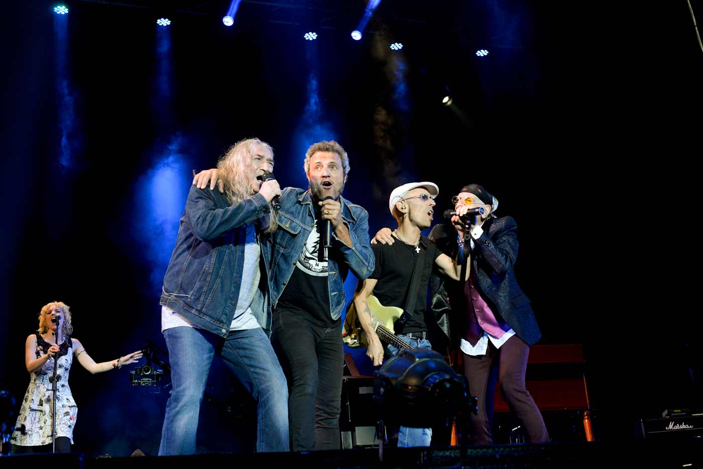 Tras un receso de veinte minutos dio comienzo la actuación de la Rythm & Blues Band. Eran las 21:30 y ahora sí, seis mil personas abarrotaban el mismo escenario en el que semanas atrás se celebró el Festival Tres Sesenta. Como ha sucedido durante el resto de la gira en este formato, a la banda habitual de El Drogas le acompañaron dos coristas y un teclista. Juntos dibujaron con nuevos colores canciones como la folky ‘Debajo de aquel árbol’, ‘Todo lo enamora’, ‘Sin reverencias’ o ‘Todos los gatos’. Fue en este tramo del concierto en el que empezaron a desfilar por el escenario los invitados: Iván Ferreiro, Ara Malikian y su violín, Quique González, Los Zigarros, Leiva, Carlos Tarque (M Clan), Fito y Luz Casal. Pero la mayor ovación se la llevó, sin lugar a dudas, Rosendo. No en vano El Drogas suele recordar que uno de los mayores impulsos que tuvo para montar una banda fue ver a Leño en Estella a principios de los 80. Y como a un patriarca le recibió también el resto de artistas, antes de interpretar al alimón ‘Otros tragos’, con la que pusieron fin a este tercer concierto.