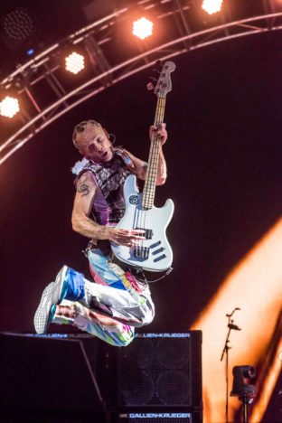 Para tener una buena posición para ver a los Red Hot hubiera sido necesario mantener los pies clavados al suelo por lo menos tres horas antes –antes del concierto de Liam Gallagher-, por lo que tuvimos que verles de lejos – como la mayoría de gente- , aunque les escuchamos bastante bien –es increíble que escucháramos peor conciertos más cercanos-. En lo meramente musical, empezar diciendo que tanto Flea como Chad Smith están en una forma envidiable, que Anthony Kiedis se conserva suficientemente bien y que Josh Klinghoffer es un digno sustituto de John Frusciante, elementos todos imprescindibles para dar un grandísimo show como el que dieron. Gracias a Dios no se centraron en sus tres últimos trabajos, aunque tuvimos que escuchar hits blandengues como “Dani California” y un puñadito de temas de “The Getaway”, y repartieron buenas cartas como “Around the World”, “Californication” o “Under the bridge”, además de magníficas versiones de “I wanna be your dog” de The Stooges o “Higher Ground” de Stevie Wonder. Para los bises, “Goodbye Angels” y un incendio final empezado con “Fire” de Jimi Hendrix y terminado en lo alto con “Give it Away”. Cumplieron las expectativas, aunque muchos esperaban verles más tiempo o más cómodos, pero esto es un festival, amigos.