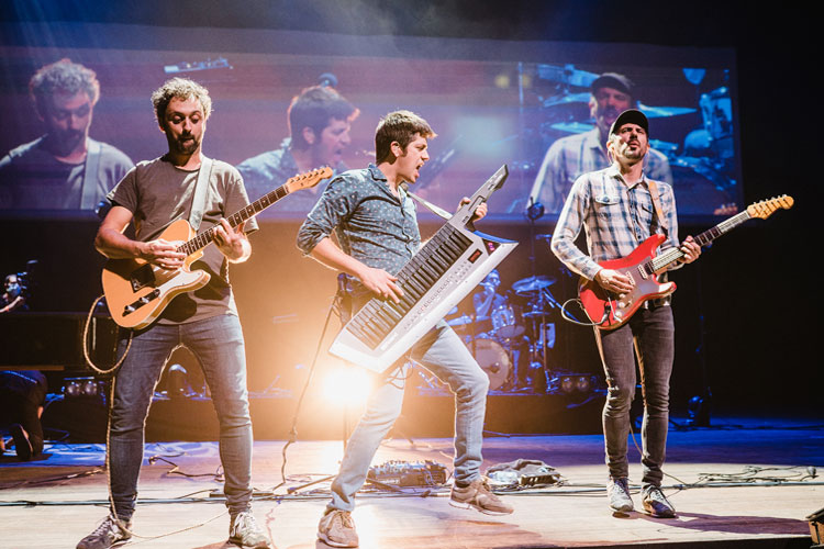 Els Amics de les Arts aprovechan el momento y, sin dejar tiempo, interpretan del tirón “Les coses”, “Kokoshcka”, el popular “4-3-3” y terminan con “El seu gran hit”. En ese momento, y aunque nos han avisado ya de que harían bises, los catalanes se despiden y abandonan el escenario. La gente empieza a ovacionarles con entusiasmo, con lo que Els Amics de les Arts –excelentemente respaldados por Ramon Aragall y Pol Cruells– aparecen de nuevo al tiempo que suenan los primeros acordes de “Adéu”, es carta de despedida que nos comentaban en la entrevista Dani, Ferran y Joan Enric. A continuación y sin tiempo a digerir lo que acaban de hacer sobre el escenario, empieza “Jean-Luc” un poco más teatralizada que de costumbre, consiguiendo una vez más que el público se anime y vuelva a levantarse para cantar y bailar.