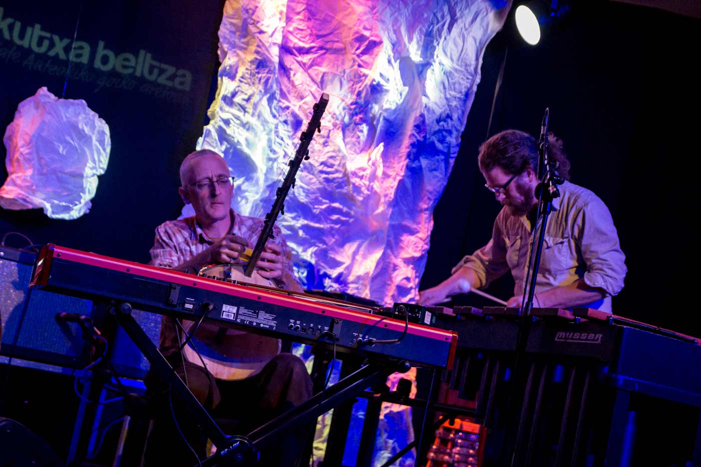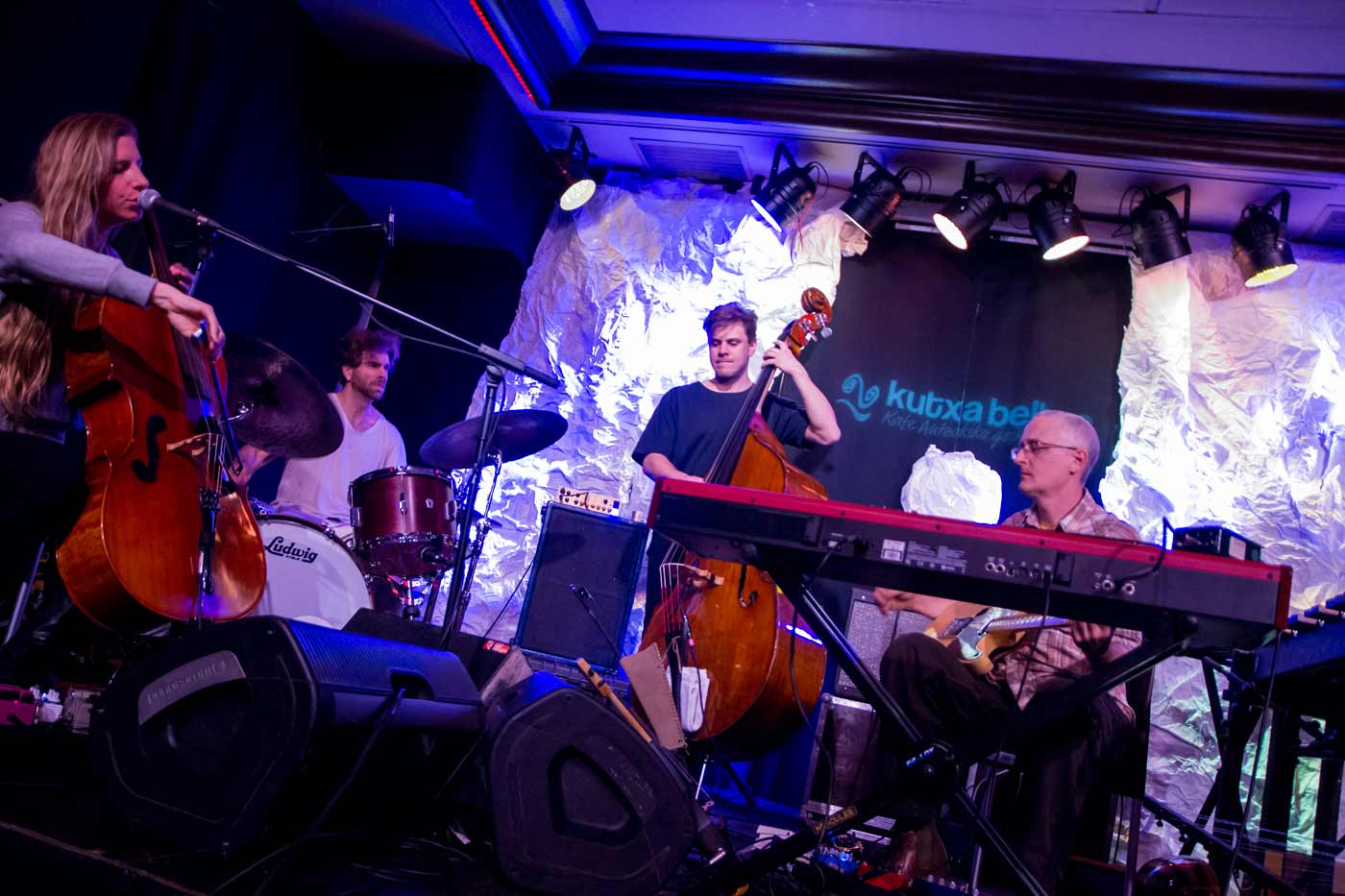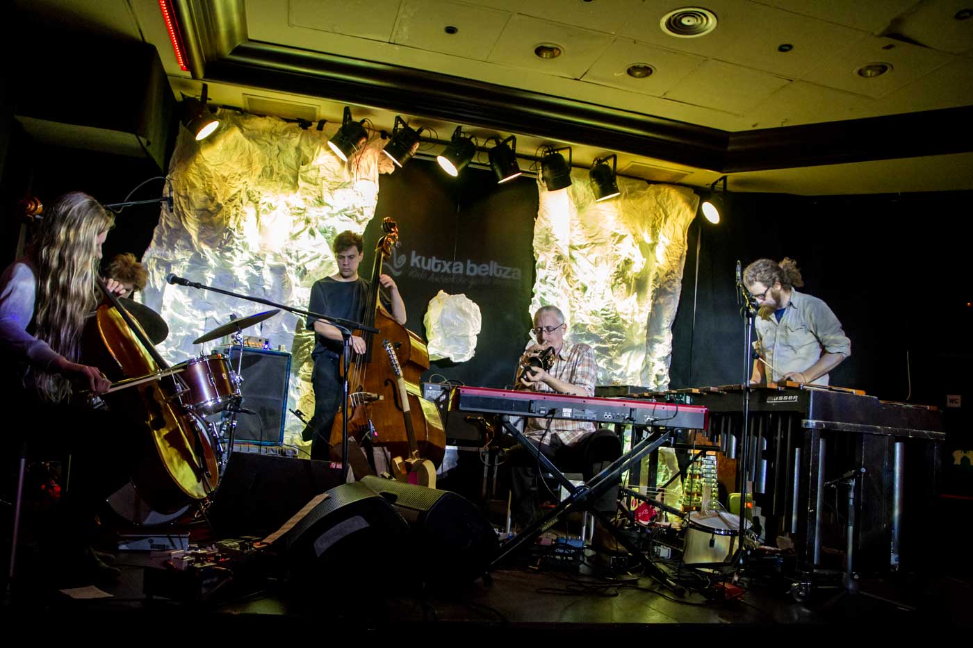 - ¿Qué es esa música? - Nada hija, un vídeo de unos que tocan esta noche. Mira cómo toca el xilofón frotando el arco de un contrabajo. - ¿Y qué tocan? ¿A cámara lenta? Pues a cámara lenta empezó el concierto de Esmerine en la parte de arriba del Kafe Antzokia, acondicionado con sillas para que el público pudiera disfrutar de la actuación de este grupo canadiense de música de cámara contemporánea.