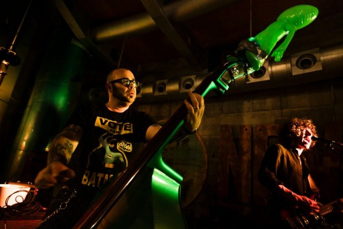 El tercer plato del festín lo sirvieron Koko, Jorge y Martín, unos Wavy Gravies, que arrancaron cantando a capela una de esas cantigas populares galegas que, al oírlas, Rosalía, te dan ganas de meter la cabeza en un barreño de ribeiro. Creo que era “Un gato metido nun saco” pero no me hagas caso, enseguida le empezó a meter guantazos Koko a su contrabajo – con un alien verde muy tieso a modo de mascarón en la proa de su clavijero – y pasamos del folclore de la tierra a otro más universal, el que va del garage al punk pasando por el rock and roll de raíces. Lo hicieron además como procede cuando entiendes que amén de tocar hay que comunicarlo. Los gestos, el sudor, la tensión que infarta las venas. Jorge se encargó de acercarse al público, mezclándose con nosotros como si estuviera pasando frío allí arriba, que seguro que no. Martín aterrorizó a sus sufridos parches, percutiendo el ritmo como si estuviera barrenando en piedra. Y Koko acompañaba con su contrabajo encrespado, haciendo del diapasón un latido cardíaco y ayudando a lucir las partes vocales, además de añadir actitud y expresividad. En torno a la hora de bolo, con casi dos docenas de canciones en inglés. Consiguieron que no hubiera clímax porque fue un continuo apogeo desde el principio al fin. Ahora, por decir, te diré que hubo una que no reconocí, “Two More Minutes” ponía en la lista, y les quedó bien lucida y pegadiza.