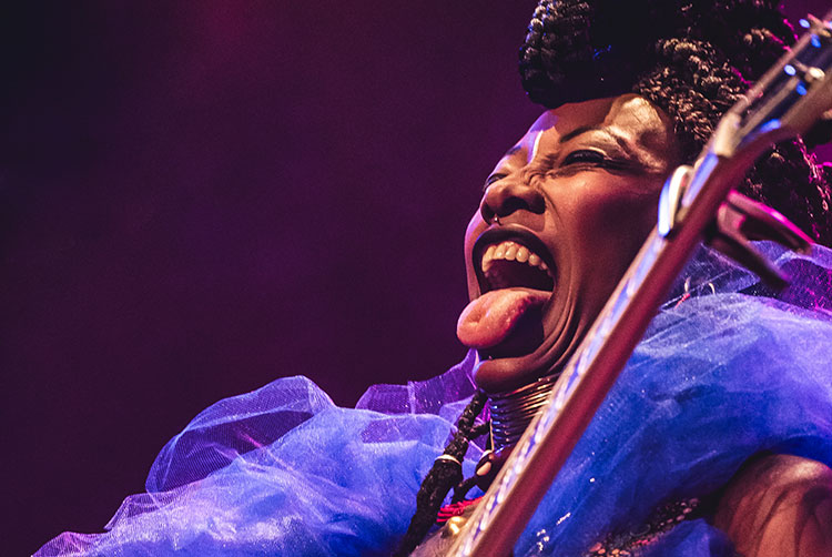 Salió la banda al escenario y empezó a funcionar esa máquina de ritmo imparable. Al poco apareció ella con su vestido africano largo y colorido y armada de su guitarra eléctrica, para regalarnos “Tolon”, un fiero afropop, que en su parte media le sirvió para mostrar la destreza y dominio que tiene de la guitarra. Eso sí, al igual que hiciera en el pasado concierto que hizo en el Grec en Barcelona en 2021, disparaba los sugerentes coros de sus canciones con una pedalera, algo novedoso y que puede parecer extraño. Pero bueno, ya hemos visto que hay quien hace conciertos con toda la música pregrabada y sin músicos.