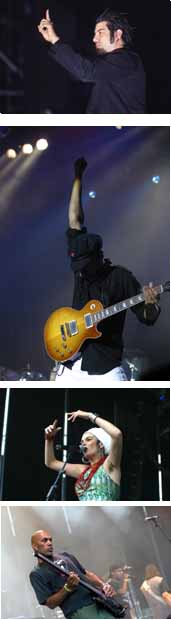 A una hora injusta para su potencial, Standstill se impusieron con uno de los conciertos más sólidos del festival, confirmando el cambio que supone su último disco, con temas donde el hardcore se encuentra con las melodías (“Ride Down The Slope”); apabullantes (“Not The Place”) y también contenidos, demostraron en cuarenta y cinco minutos por qué están en la cima del hardcore nacional. Sorkun también batallaron arduamente con la adversidad de tocar en un horario y a una temperatura nada favorables a sus intereses y a los de una propuesta recia y contundente pero matizada por detalles –la voz espléndida de Sorkun, principalmente- que precisan de una mayor atención. El hip hop de SFDK tuvo que luchar contra los elementos (el viento principalmente), y en la contienda las bases de Acción Sánchez no brillaron como deben y la voz de Zatu no tuvo la crudeza que demuestra “2001. Odisea en el lodo”, aunque levantaron los ánimos con “Desafío total” y acabaron ensayando un karaoke rapero con aquello de “De costa a costa / disfruten del show”. Ojos de Brujo tenían a un público cómodo, numeroso y dispuesto para balancearse al ritmo callejero del combo catalán que, con un repertorio cada vez más consolidado y unas contagiosas ganas en directo, no tuvo problema para convencer a propios y extraños en una de las actuaciones del festival. Hell Is For Heroes afrontaron su concierto con un entusiasmo que no logró contagiarse más allá de las primeras filas. Injustamente, porque su oferta era un valor casi seguro y su actuación fue una de las sorpresas más agradables de la jornada, al igual que la de Iffy, que con una fórmula sencilla de funk, pop, rock y un toque de electrónica pusieron a bailar a las primeras filas. Lo suyo no es nuevo, y a veces se queda sólo en repetido, pero es música fresca y solvente, con tema un (“Double Dutch”) que es valor seguro. Lo que no nos pilló de sorpresa fueron las buenas maneras de Asian Dub Foundation, porque, sin duda, uno de los mejores directos del festival fue el suyo, con una radical y contagiosa mezcla de drum´n´bass, dub, reggae y hip hop. Ni la lluvia (un aderezo más para la diversión) empañó a un público entregado por completo al combo anglo-pakistaní. Tras la tormenta, mucho público esperaba a Molotov, quienes se mostraron tan fiesteros como previsibles. Lo que no esperábamos era que Public Enemy pincharan en una actuación desapasionada. Con decir que lo más destacable fue su colaboración en un tema junto a Audioslave... en fin, que las viejas glorias no son eternas. Por su parte, Morello, Cornell y compañía presentaron un directo convincente, aparentemente rendidos a un público que disfrutó con su arenga setentera. Se suponía que ahí terminaba todo, pero el traslado de la actuación de Radio 4 a un horario indigno de su valía alargó un poco más el evento. Los que allí estuvimos encontramos a los de Nueva York entregados a un directo intenso aunque corto, dosificando las gemas de “Gotham” entre frenéticas guitarras y percusiones con pegajosos ritmos bailables, marcando un sello de calidad que pocos grupos dejaron ese día.