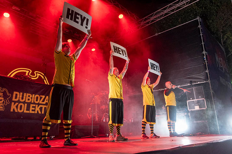 Pero si de bailar hablamos, los pogos que se formaron con Dubioza Kolektiv (en la foto principal) fueron de traca. Los bosnios tienen un directo apabullante, sin momento de respiro y con constantes guiños divertidos a su público. Los hemos visto en numerosas ocasiones y nunca fallan, pero es que su repertorio está hecho a prueba de estatuas. La secuencia de “Free.mp3”, “Kažu”, “Himna Generacije” (en la que se les unió el trompetista bosnio Miron Rafajlović que había tocado con Joao Frade), “Rakija”, “Boom”, “Red Carpet” y el “Hay Libertad” que grabaran con La Pegatina, fue impecable. Subieron al escenario vestidos con camisetas amarillas y pantalones cortos negros, para enfatizar ese sentimiento de equipo y aunque su festiva música de raíz balcánica se nutre de ska, reggae y punk, ellos siguen lanzando mensajes de esperanza y resiliencia en estos tiempos de incertidumbre.