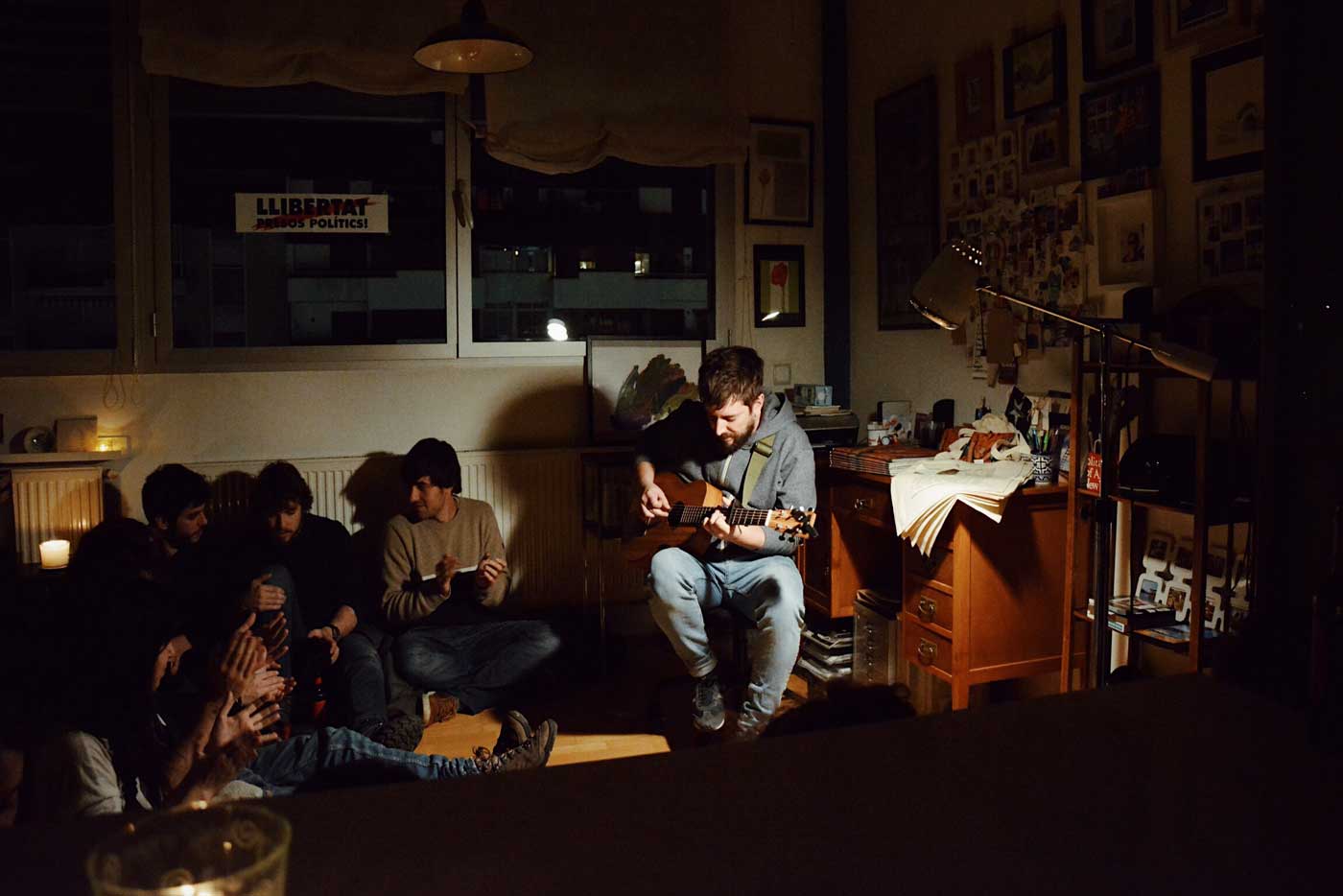 Para cerrar la noche del sábado Pau Vallvé se pasó por El Mini como parte de su “Gira per menjadors”, una idea que nació precisamente gracias al festival olotín y que le llevará a tocar por los salones de casas particulares de toda Catalunya durante los meses de febrero y marzo. Y este sí fue un concierto al más puro estilo Mini. El barcelonés se presentó en el comedor de un dúplex abarrotado por más de 40 personas con solo un guitalele. Sin micros, sin amplificadores, sin nada más que una arrugada e improvisada setlist que no dejó de consultar a lo largo de su actuación. Y si algo tiene Vallvé es que se siente muy cómodo enfrentándose al público de tú a tú. El cantautor empezó la actuación con la íntima “Encara no” prometiendo intentar no hablar más de la cuenta, promesa que no pudo ni quiso cumplir. Y eso, lejos de ser una debilidad, para Vallvé es una virtud. Políticamente incorrecto y con un humor negro digno de un comediante de stand up, consiguió llevarse al público a su terreno. Humor sin filtros, tratando temas tan delicados como el suicidio, la depresión o el cáncer con descaro y con una sonrisa traviesa de quién sabe que está consiguiendo su objetivo: hacer reír y entretener. Sin duda el humor y la buena música siempre han sido un buen cocktail. Pese a no llevar a la banda consigo para la ocasión, las aptitudes de Vallvé a la guitarra quedaron más que demostradas en piezas como “17820” o “Protagonistes”, sin olvidar otros hits que hicieron cantar al público a pleno pulmón como “El millor de marxar és tornar” o “Tots som molt millors”, con la que acabó una magnífica actuación de casi dos horas.